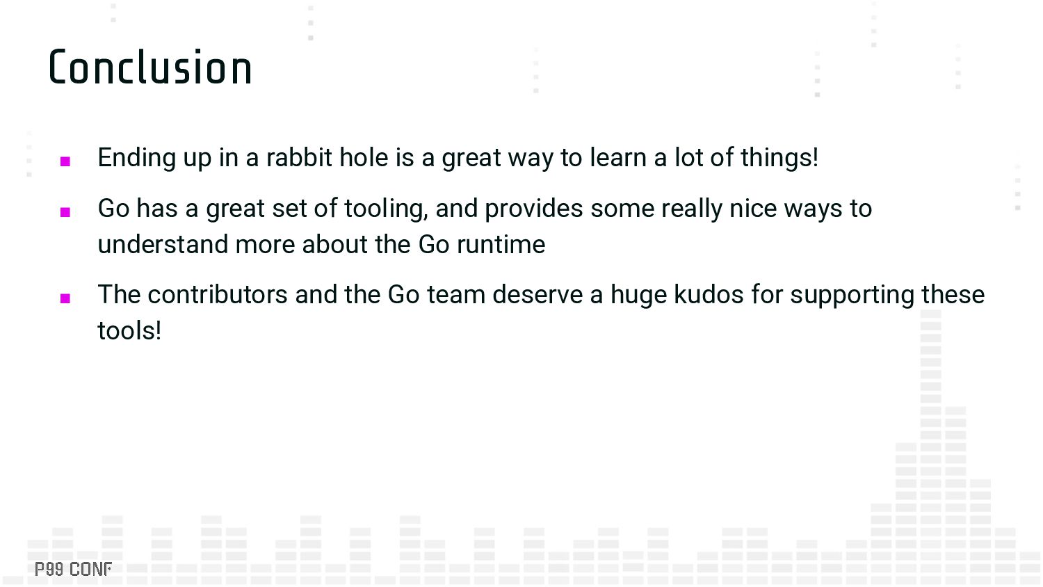 great way to learn a lot of things! ▪ Go has a great set of tooling, and provides some really nice ways to understand more about the Go runtime ▪ The contributors and the Go team deserve a huge kudos for supporting these tools!