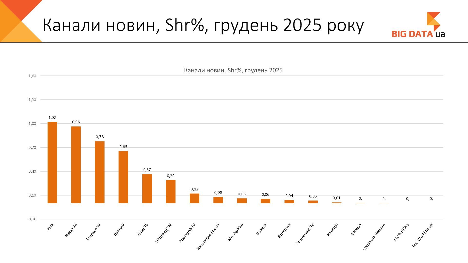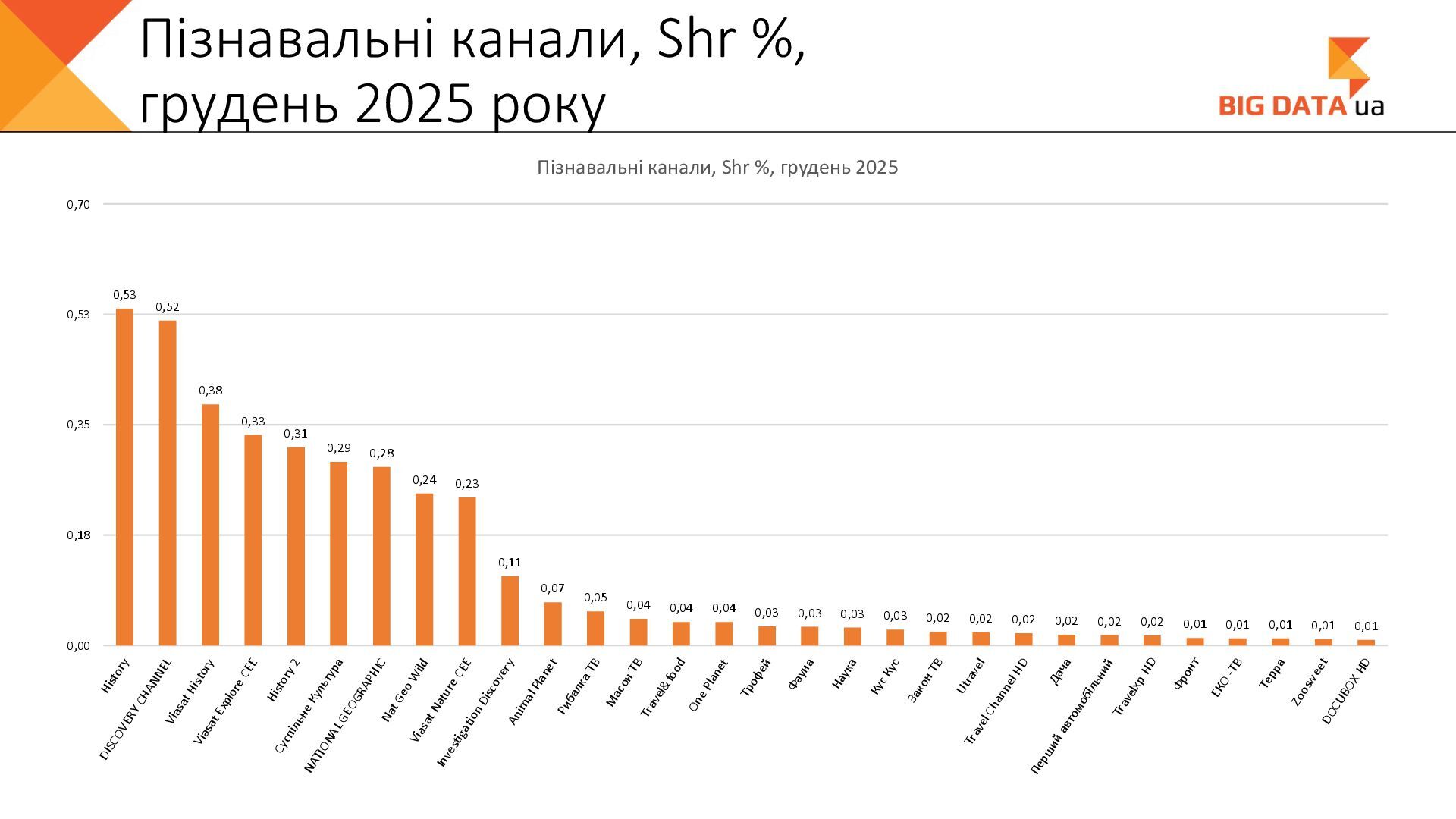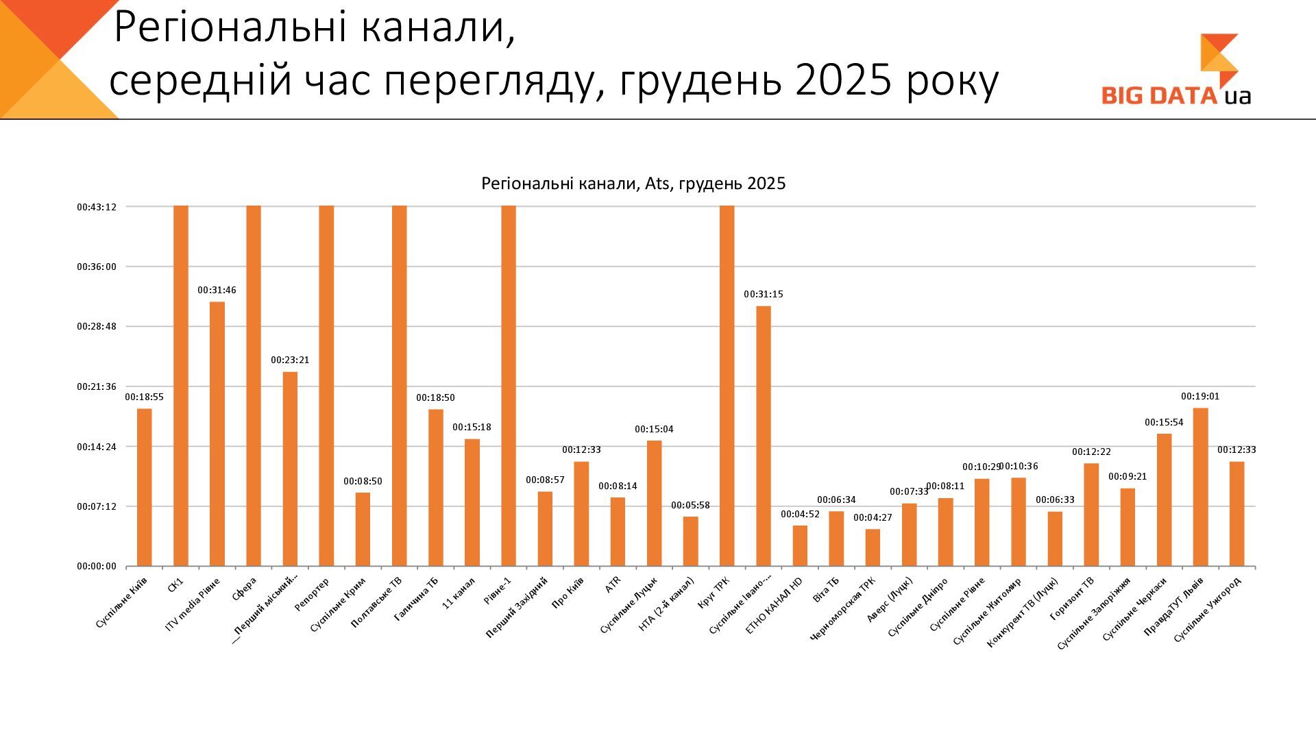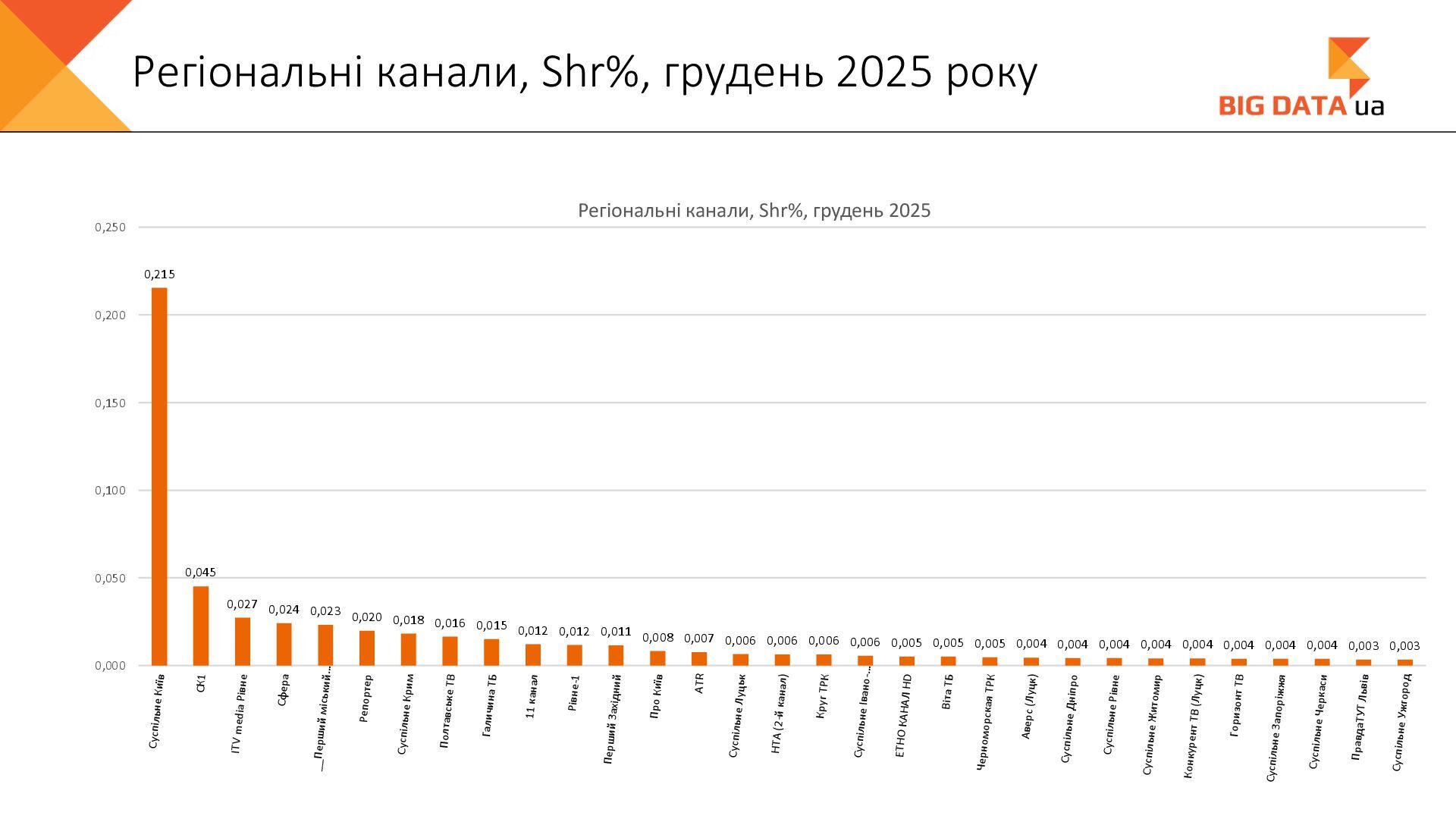 0,023 0,020 0,018 0,016 0,015 0,012 0,012 0,011 0,008 0,007 0,006 0,006 0,006 0,006 0,005 0,005 0,005 0,004 0,004 0,004 0,004 0,004 0,004 0,004 0,004 0,003 0,003 0,000 0,050 0,100 0,150 0,200 0,250 Суспільне Київ СК1 ITV media Рівне Сфера __Перший міський … Репортер Суспільне Крим Полтавське ТВ Галичина ТБ 11 канал Рівне-1 Перший Західний Про Київ ATR Суспільне Луцьк НТА (2-й канал) Круг ТРК Суспільне Івано-… ЕТНО КАНАЛ HD Віта ТБ Черноморская ТРК Аверс (Луцк) Суспільне Дніпро Суспільне Рівне Суспільне Житомир Конкурент ТВ (Луцк) Горизонт ТВ Суспільне Запоріжжя Суспільне Черкаси ПравдаТУТ Львів Суспільне Ужгород Регіональні канали, Shr%, грудень 2025