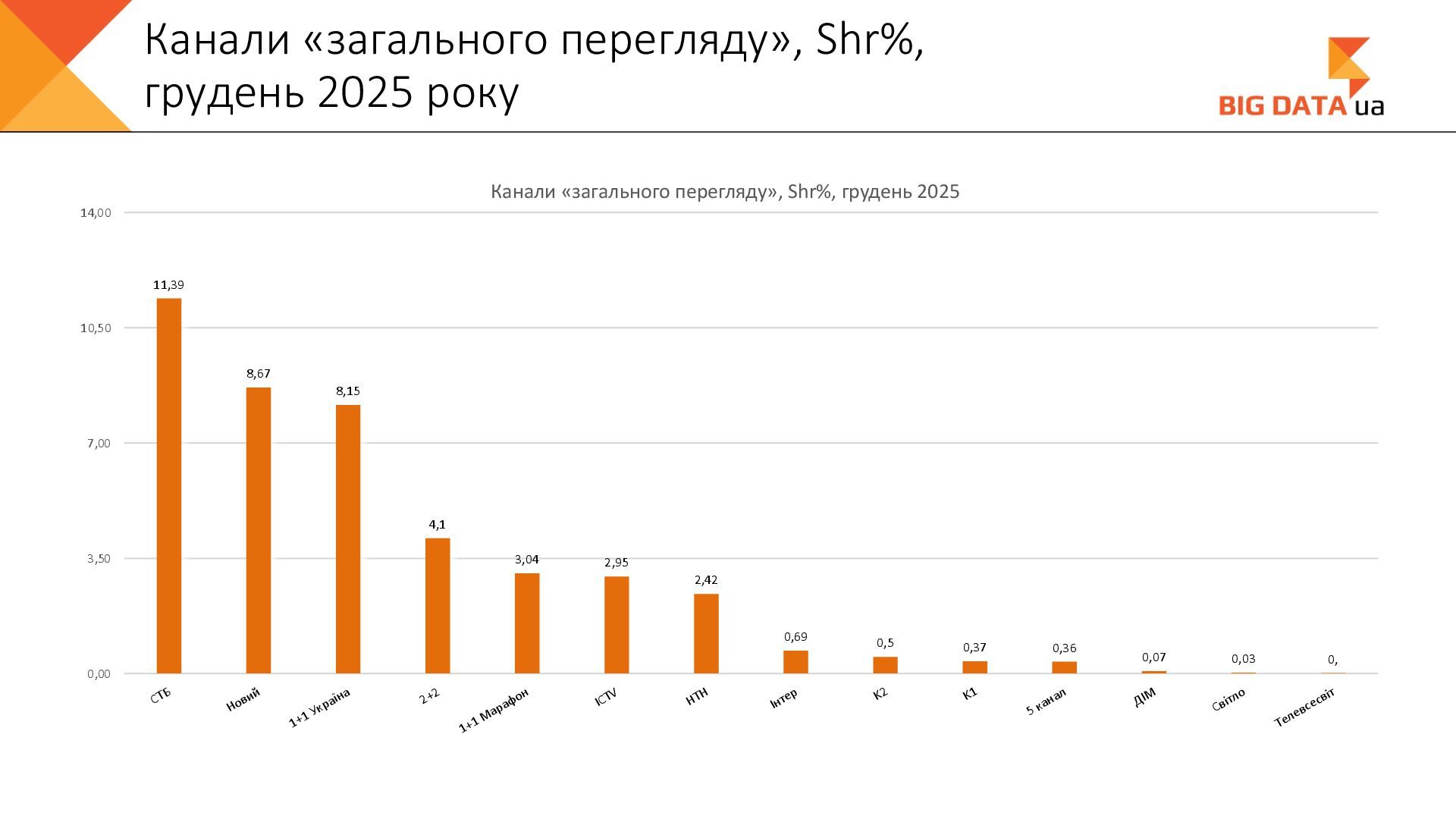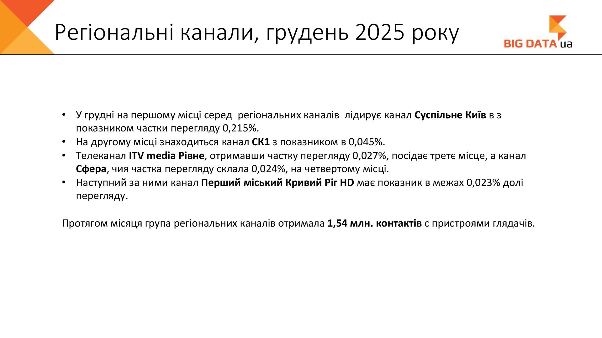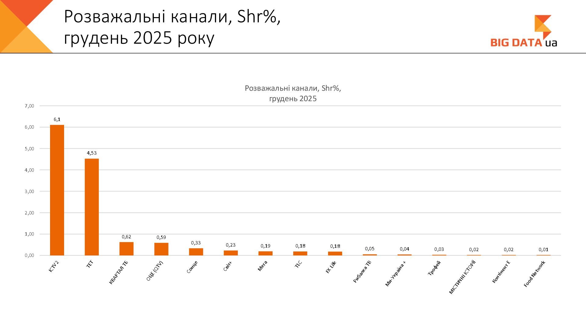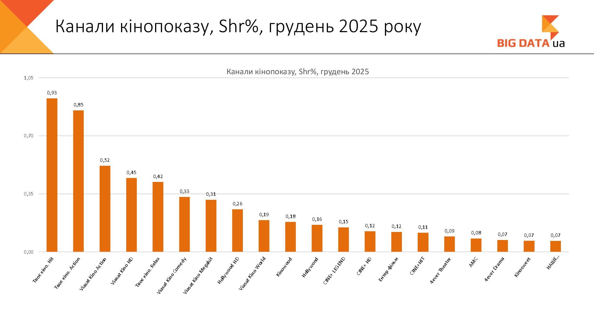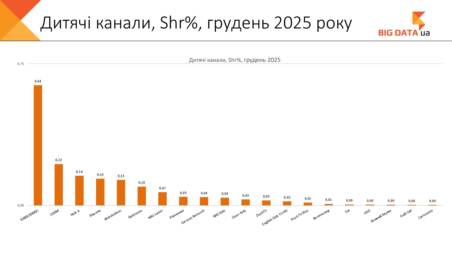 0,023 0,020 0,018 0,016 0,015 0,012 0,012 0,011 0,008 0,007 0,006 0,006 0,006 0,006 0,005 0,005 0,005 0,004 0,004 0,004 0,004 0,004 0,004 0,004 0,004 0,003 0,003 0,000 0,050 0,100 0,150 0,200 0,250 Суспільне Київ СК1 ITV media Рівне Сфера __Перший міський … Репортер Суспільне Крим Полтавське ТВ Галичина ТБ 11 канал Рівне-1 Перший Західний Про Київ ATR Суспільне Луцьк НТА (2-й канал) Круг ТРК Суспільне Івано-… ЕТНО КАНАЛ HD Віта ТБ Черноморская ТРК Аверс (Луцк) Суспільне Дніпро Суспільне Рівне Суспільне Житомир Конкурент ТВ (Луцк) Горизонт ТВ Суспільне Запоріжжя Суспільне Черкаси ПравдаТУТ Львів Суспільне Ужгород Регіональні канали, Shr%, грудень 2025