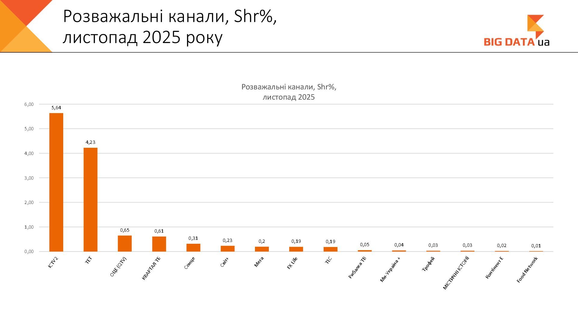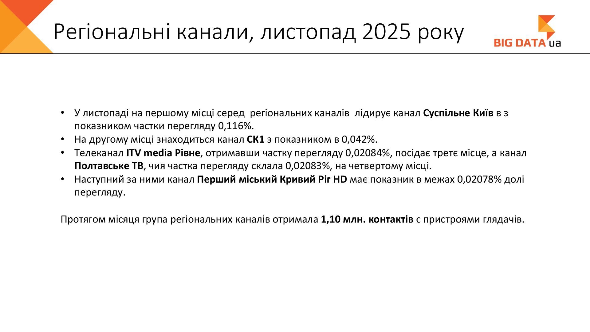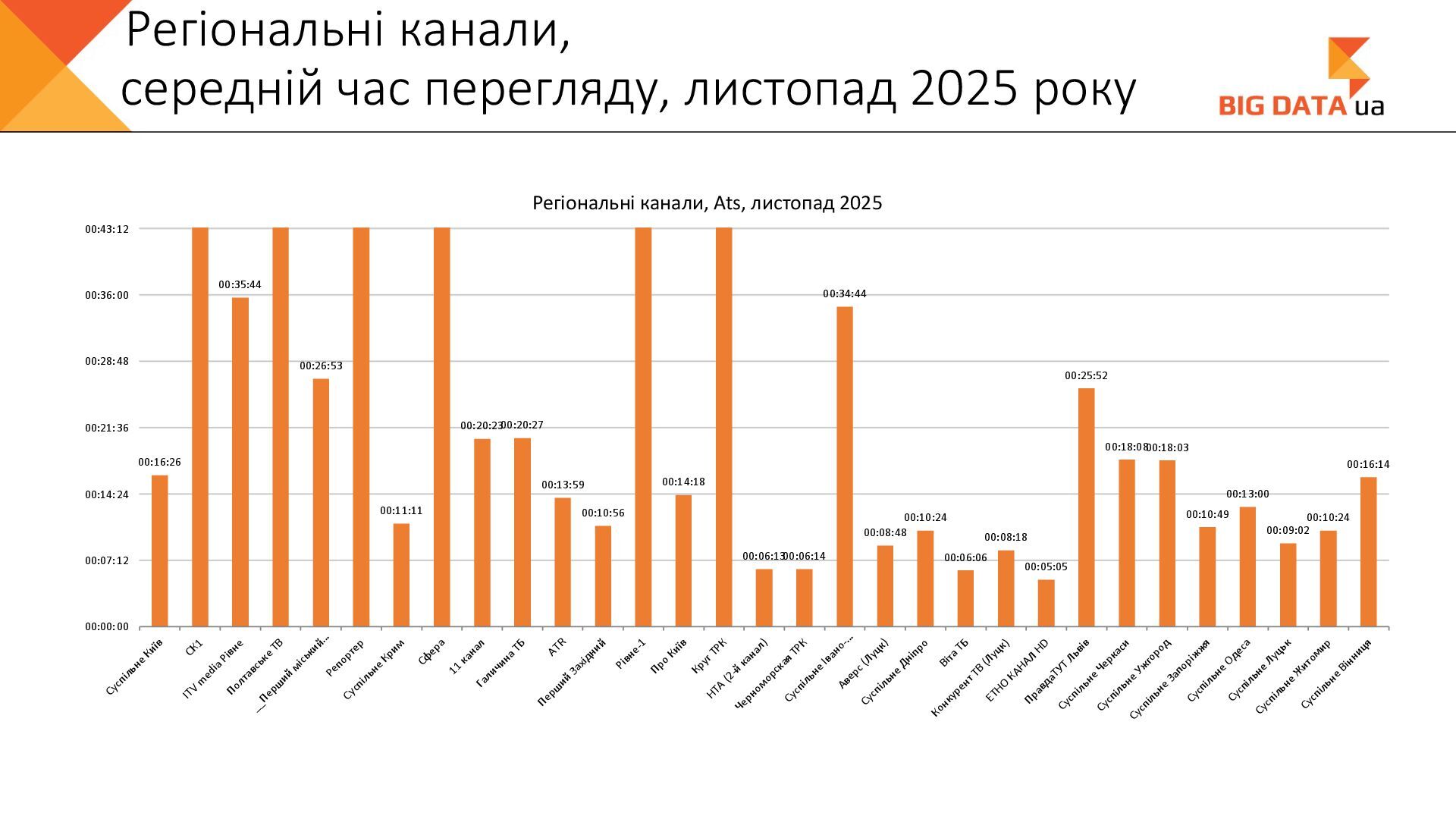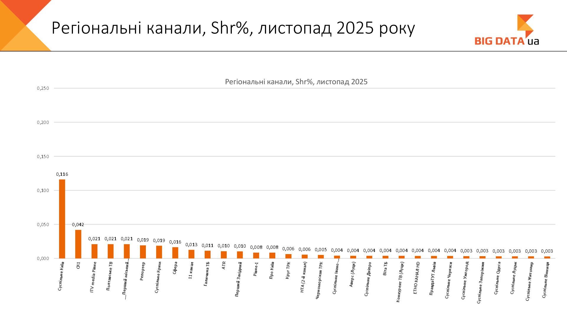 0,021 0,019 0,019 0,016 0,013 0,011 0,010 0,010 0,008 0,008 0,006 0,006 0,005 0,004 0,004 0,004 0,004 0,004 0,004 0,004 0,004 0,003 0,003 0,003 0,003 0,003 0,003 0,000 0,050 0,100 0,150 0,200 0,250 Суспільне Київ СК1 ITV media Рівне Полтавське ТВ __Перший міський … Репортер Суспільне Крим Сфера 11 канал Галичина ТБ ATR Перший Західний Рівне-1 Про Київ Круг ТРК НТА (2-й канал) Черноморская ТРК Суспільне Івано-… Аверс (Луцк) Суспільне Дніпро Віта ТБ Конкурент ТВ (Луцк) ЕТНО КАНАЛ HD ПравдаТУТ Львів Суспільне Черкаси Суспільне Ужгород Суспільне Запоріжжя Суспільне Одеса Суспільне Луцьк Суспільне Житомир Суспільне Вінниця Регіональні канали, Shr%, листопад 2025
