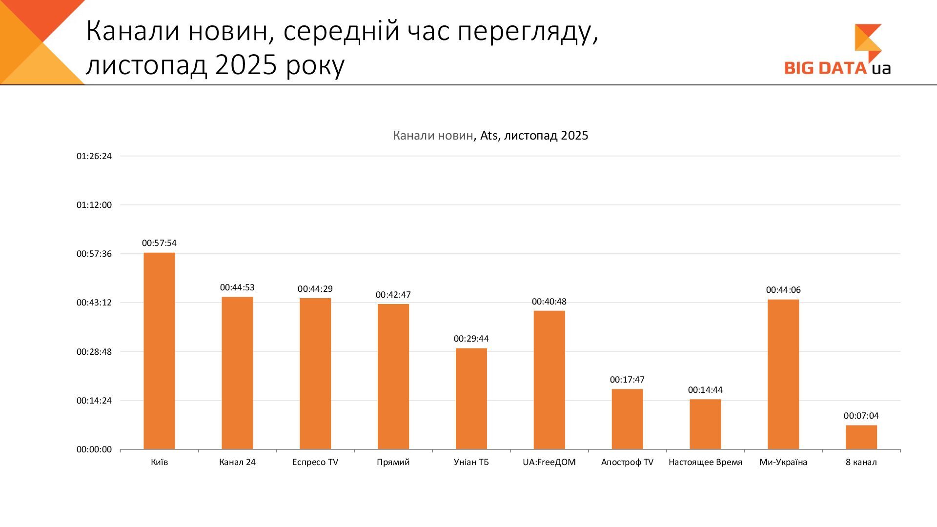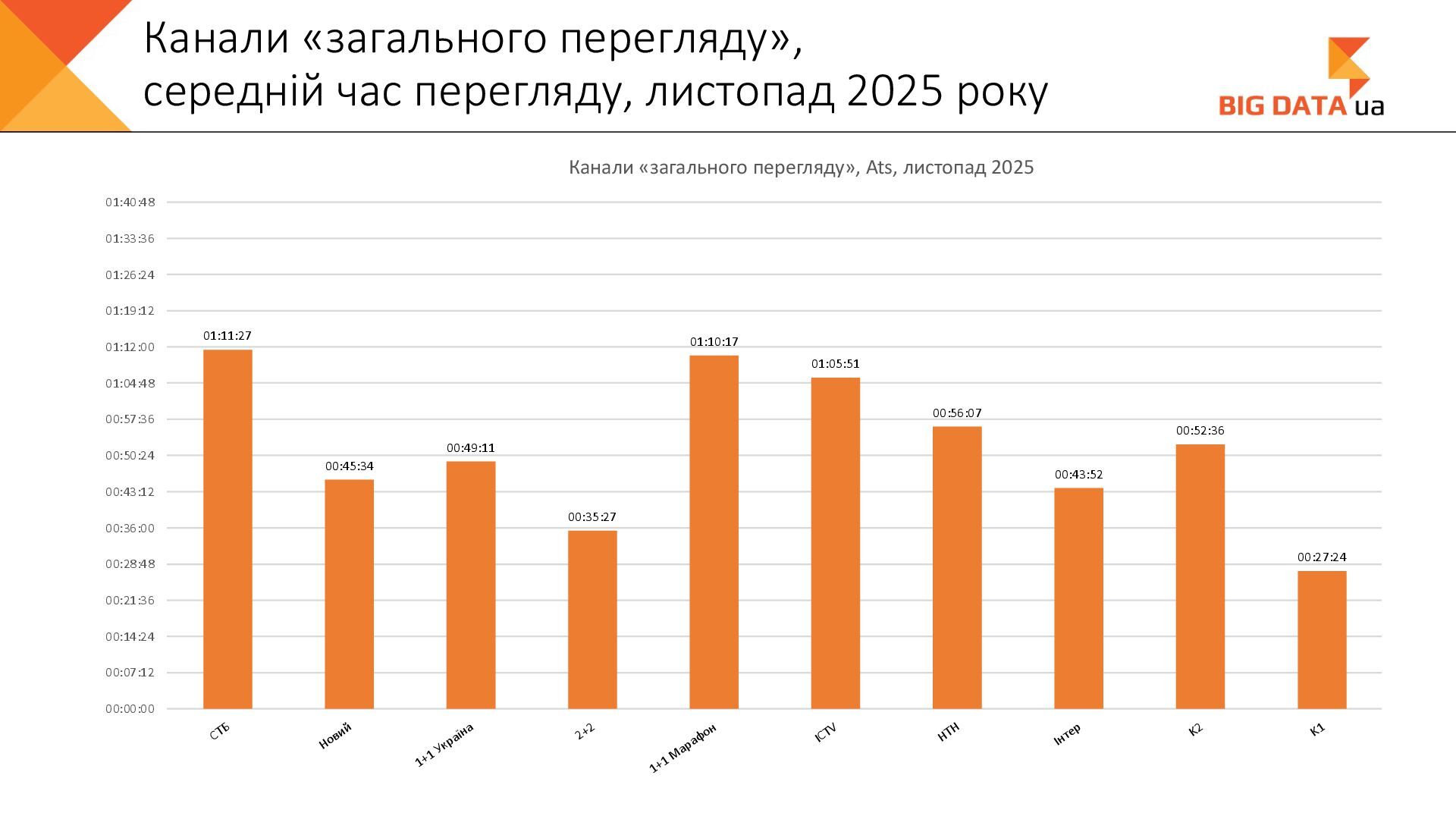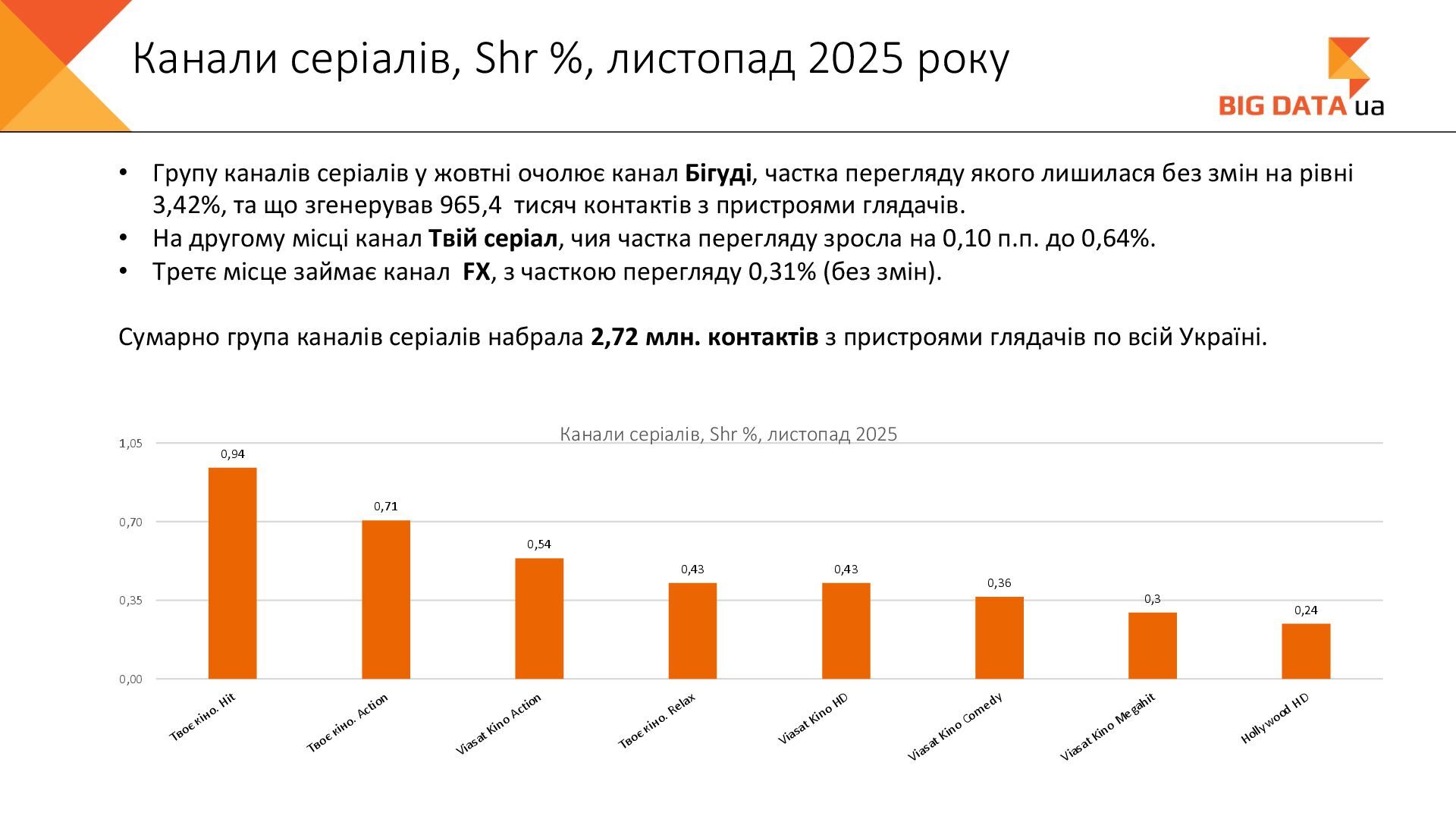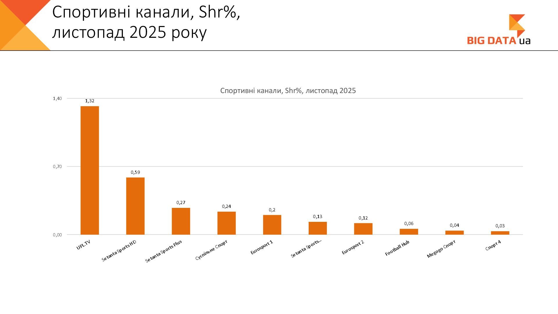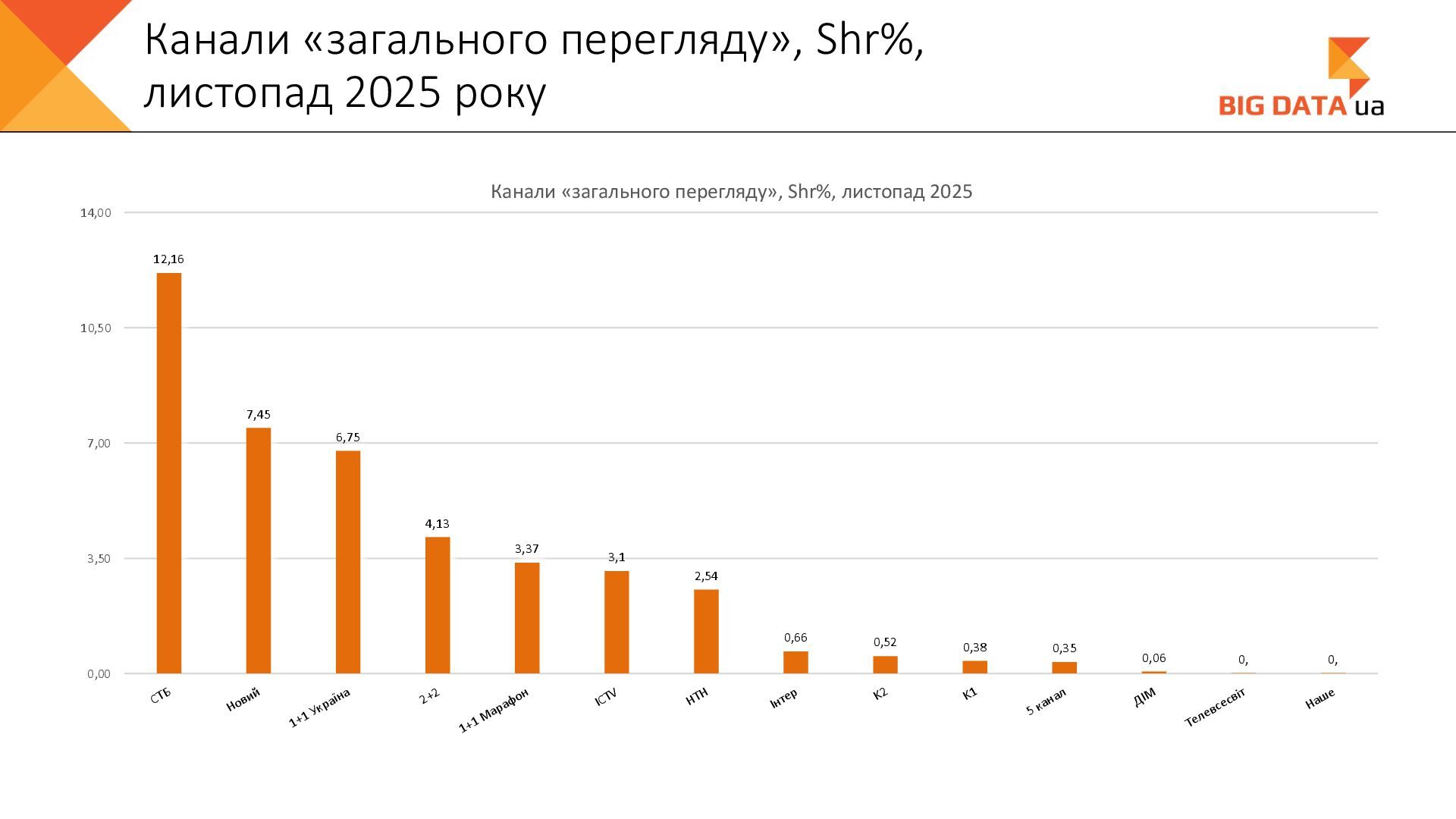 0,021 0,019 0,019 0,016 0,013 0,011 0,010 0,010 0,008 0,008 0,006 0,006 0,005 0,004 0,004 0,004 0,004 0,004 0,004 0,004 0,004 0,003 0,003 0,003 0,003 0,003 0,003 0,000 0,050 0,100 0,150 0,200 0,250 Суспільне Київ СК1 ITV media Рівне Полтавське ТВ __Перший міський … Репортер Суспільне Крим Сфера 11 канал Галичина ТБ ATR Перший Західний Рівне-1 Про Київ Круг ТРК НТА (2-й канал) Черноморская ТРК Суспільне Івано-… Аверс (Луцк) Суспільне Дніпро Віта ТБ Конкурент ТВ (Луцк) ЕТНО КАНАЛ HD ПравдаТУТ Львів Суспільне Черкаси Суспільне Ужгород Суспільне Запоріжжя Суспільне Одеса Суспільне Луцьк Суспільне Житомир Суспільне Вінниця Регіональні канали, Shr%, листопад 2025