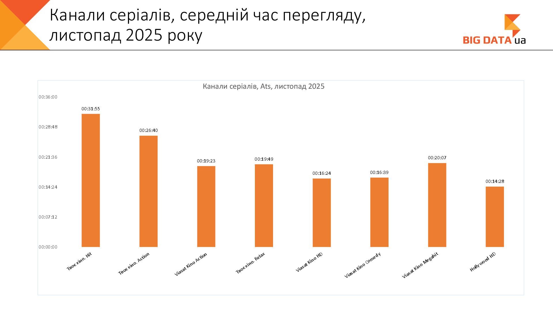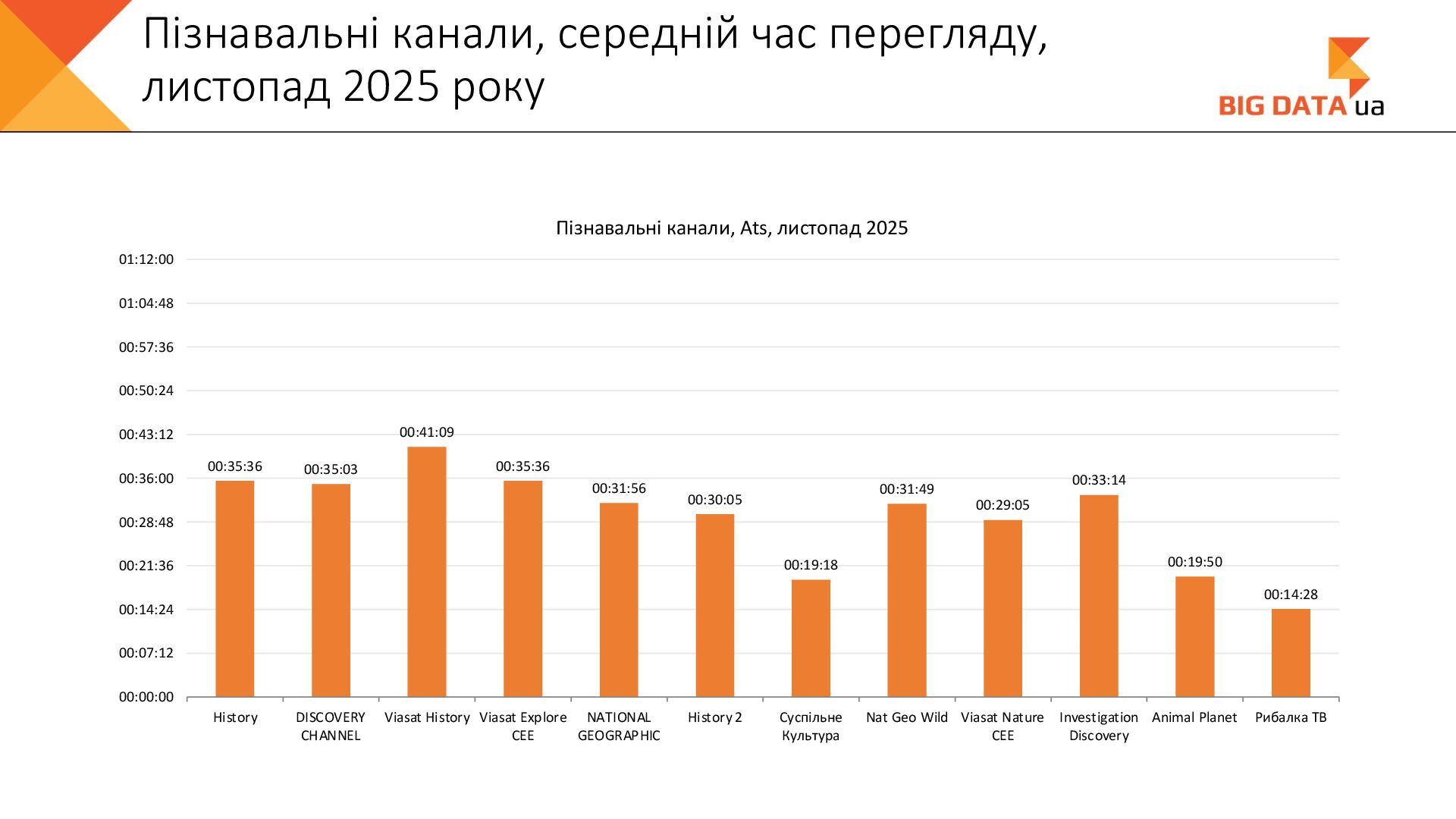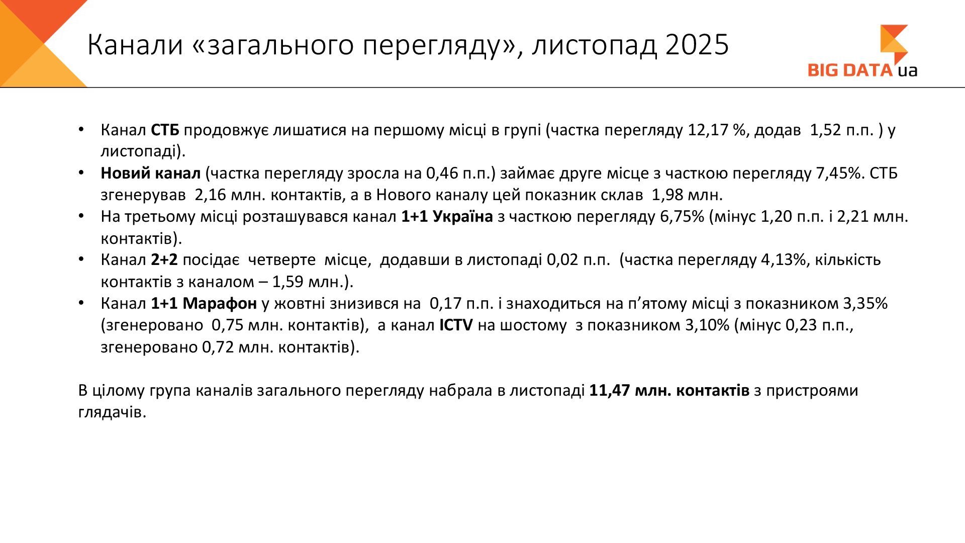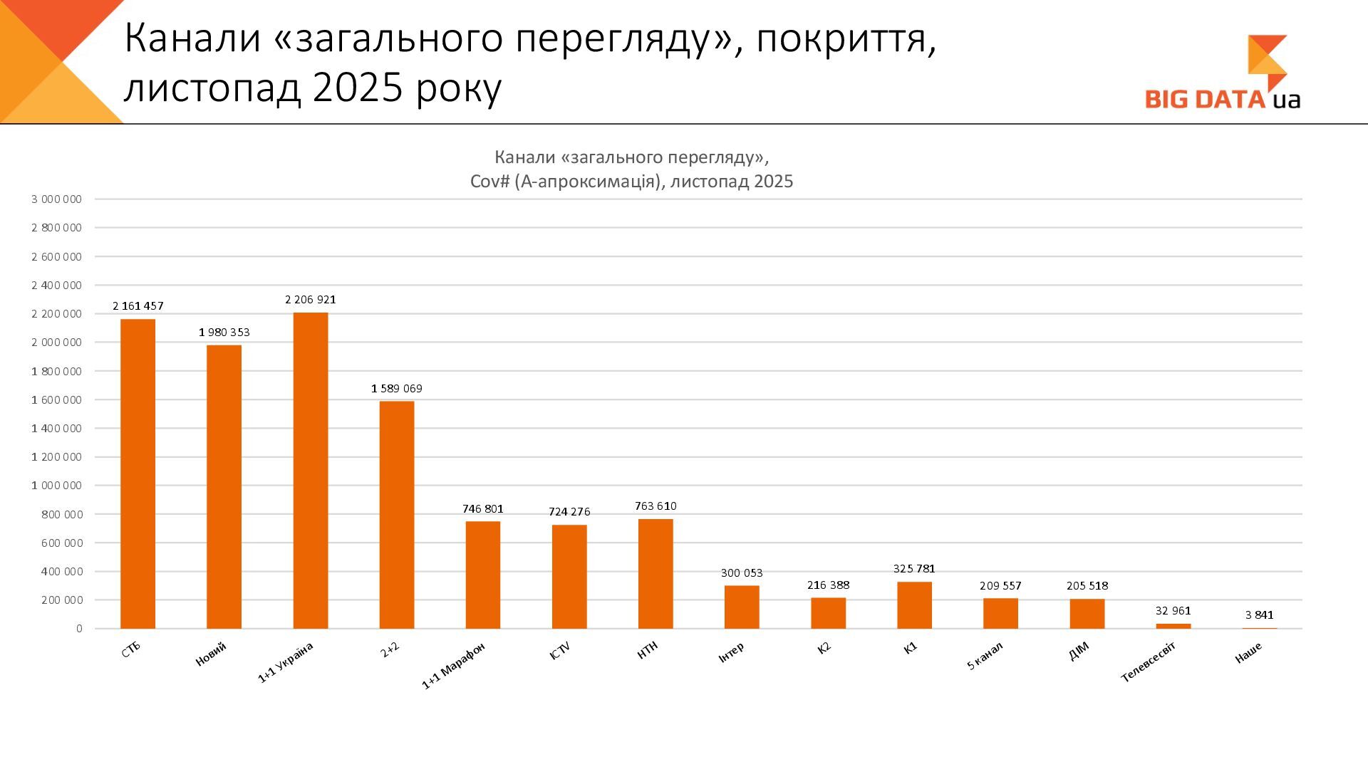 0,021 0,019 0,019 0,016 0,013 0,011 0,010 0,010 0,008 0,008 0,006 0,006 0,005 0,004 0,004 0,004 0,004 0,004 0,004 0,004 0,004 0,003 0,003 0,003 0,003 0,003 0,003 0,000 0,050 0,100 0,150 0,200 0,250 Суспільне Київ СК1 ITV media Рівне Полтавське ТВ __Перший міський … Репортер Суспільне Крим Сфера 11 канал Галичина ТБ ATR Перший Західний Рівне-1 Про Київ Круг ТРК НТА (2-й канал) Черноморская ТРК Суспільне Івано-… Аверс (Луцк) Суспільне Дніпро Віта ТБ Конкурент ТВ (Луцк) ЕТНО КАНАЛ HD ПравдаТУТ Львів Суспільне Черкаси Суспільне Ужгород Суспільне Запоріжжя Суспільне Одеса Суспільне Луцьк Суспільне Житомир Суспільне Вінниця Регіональні канали, Shr%, листопад 2025
