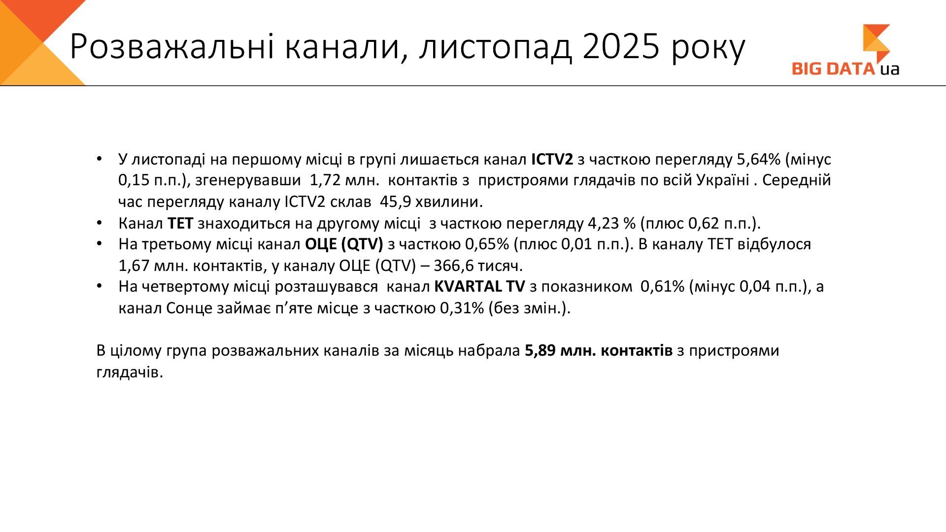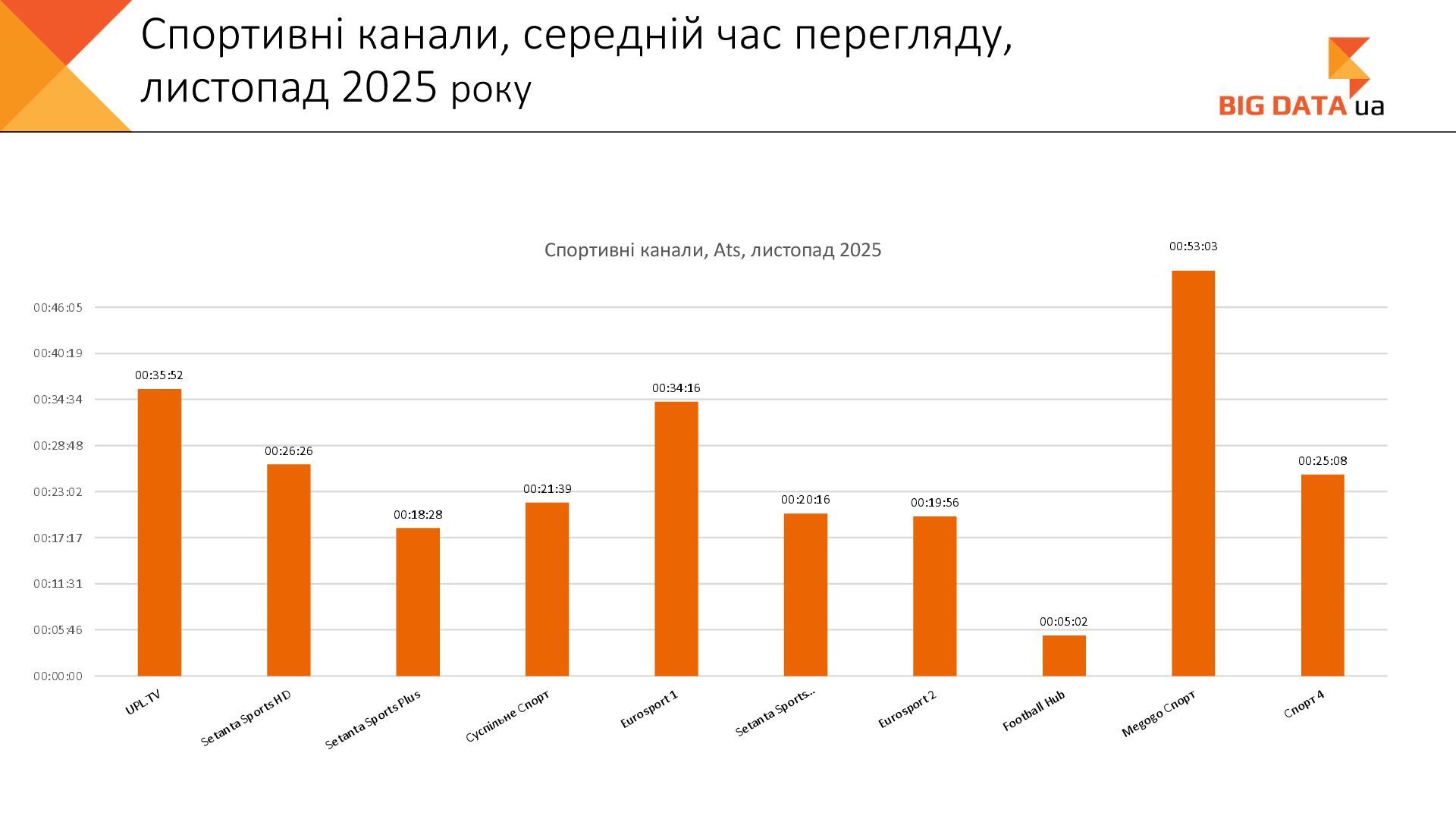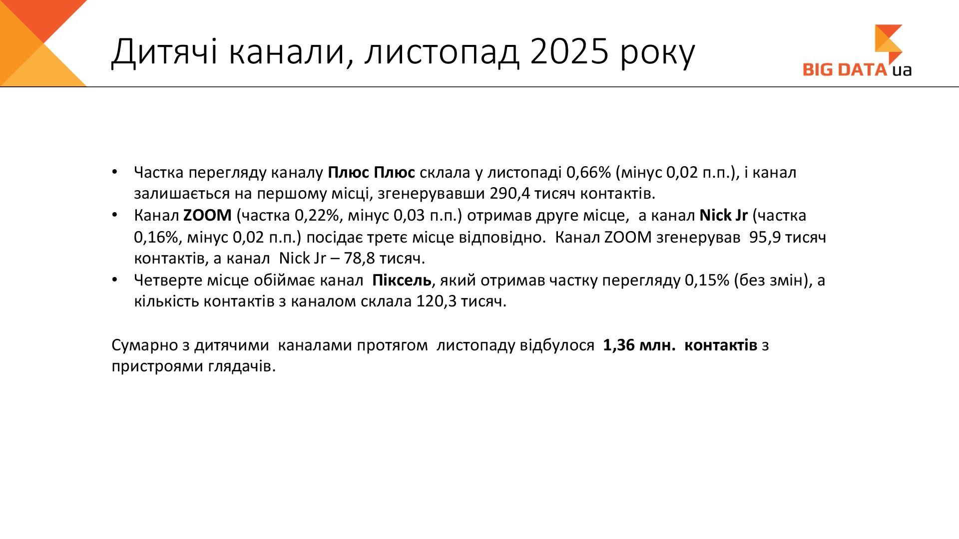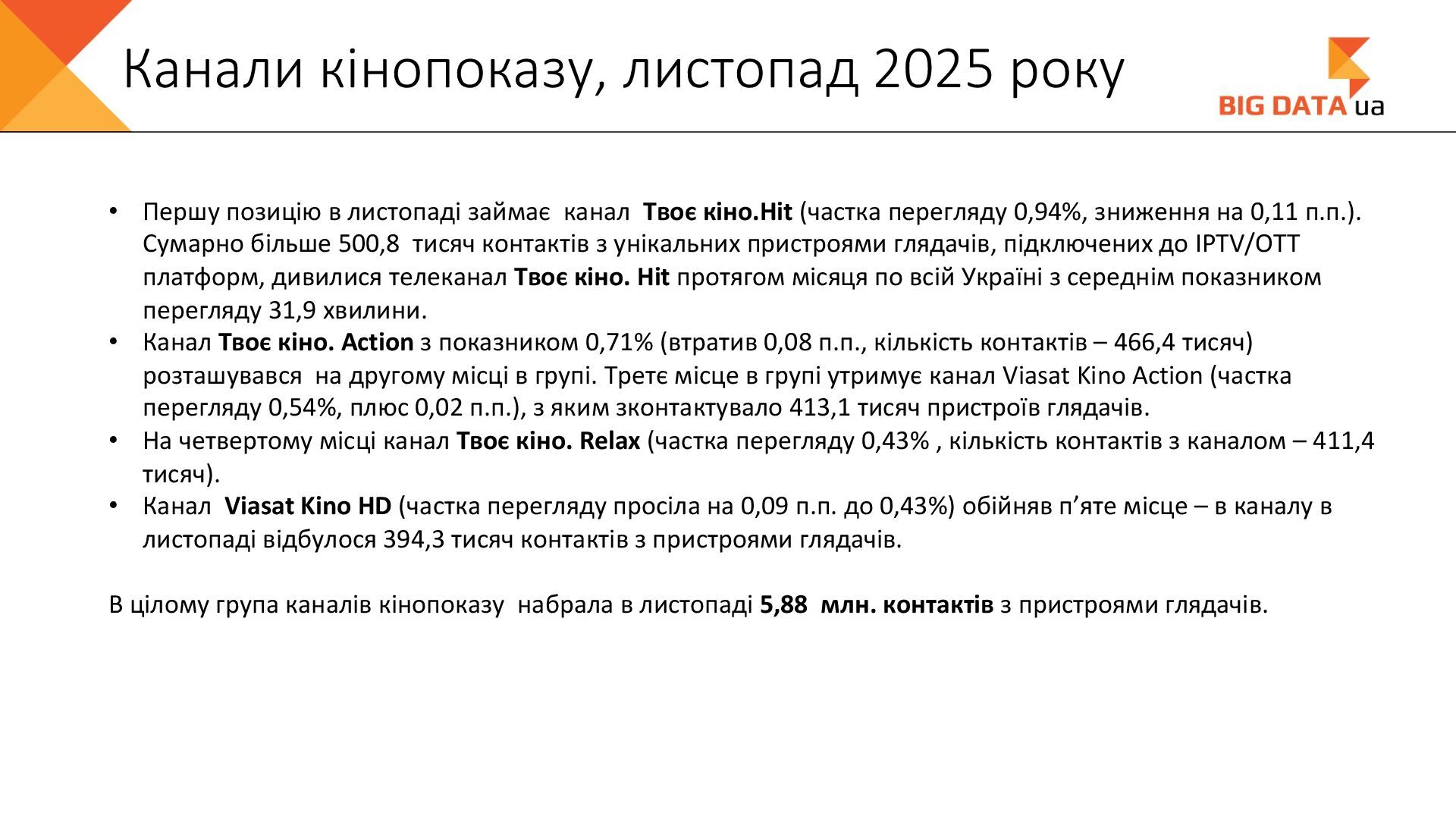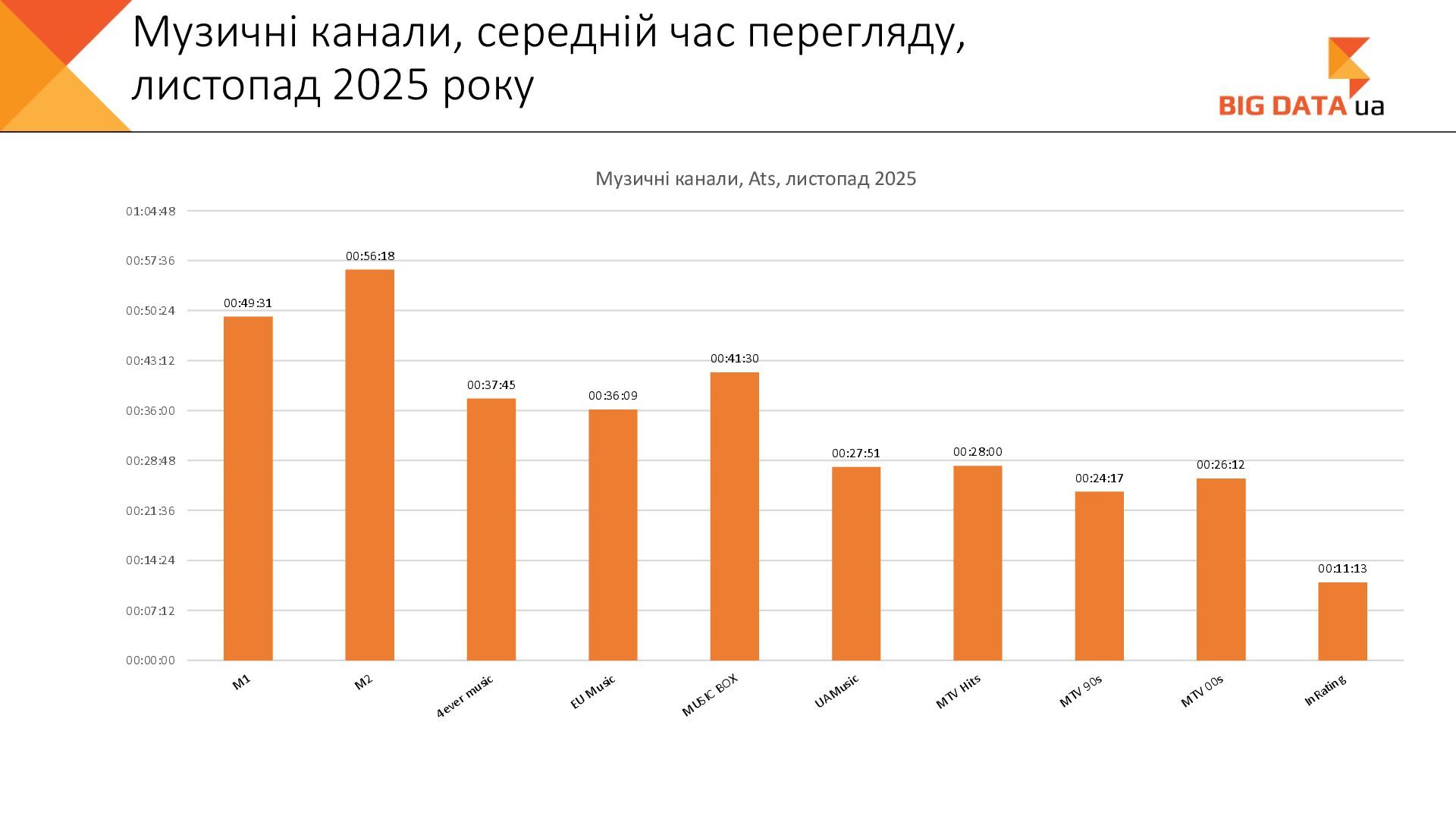 0,021 0,019 0,019 0,016 0,013 0,011 0,010 0,010 0,008 0,008 0,006 0,006 0,005 0,004 0,004 0,004 0,004 0,004 0,004 0,004 0,004 0,003 0,003 0,003 0,003 0,003 0,003 0,000 0,050 0,100 0,150 0,200 0,250 Суспільне Київ СК1 ITV media Рівне Полтавське ТВ __Перший міський … Репортер Суспільне Крим Сфера 11 канал Галичина ТБ ATR Перший Західний Рівне-1 Про Київ Круг ТРК НТА (2-й канал) Черноморская ТРК Суспільне Івано-… Аверс (Луцк) Суспільне Дніпро Віта ТБ Конкурент ТВ (Луцк) ЕТНО КАНАЛ HD ПравдаТУТ Львів Суспільне Черкаси Суспільне Ужгород Суспільне Запоріжжя Суспільне Одеса Суспільне Луцьк Суспільне Житомир Суспільне Вінниця Регіональні канали, Shr%, листопад 2025