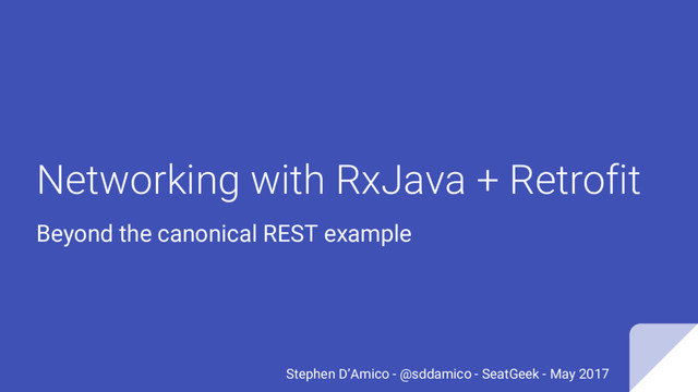 of learning networking with RxJava + Retrofit, you’ve seen a code example that looks something like this... interface SeatGeekApi { @GET("events") Observable<EventsResponse> getUpcomingEvents(); } Retrofit retrofit = new Retrofit.Builder() .baseUrl("https://api.seatgeek.com/") .build(); SeatGeekApi api = retrofit.create(SeatGeekApi.class); api.getUpcomingEvents() .subscribeOn(Schedulers.io()) .observeOn(AndroidSchedulers.mainThread()) .subscribe(events -> { // do something with events }, error -> { // handle errors });