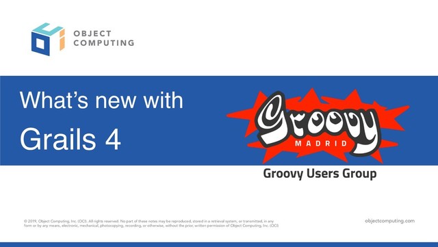 No part of these notes may be reproduced, stored in a retrieval system, or transmitted, in any form or by any means, electronic, mechanical, photocopying, recording, or otherwise, without the prior, written permission of Object Computing, Inc. (OCI) What’s new with Grails 4