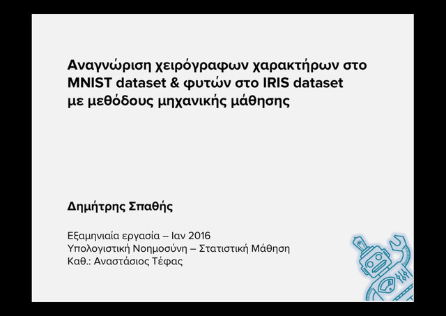 dataset με μεθόδους μηχανικής μάθησης Δημήτρης Σπαθής Εξαμηνιαία εργασία – Ιαν 2016 Υπολογιστική Νοημοσύνη – Στατιστική Μάθηση Καθ.: Αναστάσιος Τέφας
