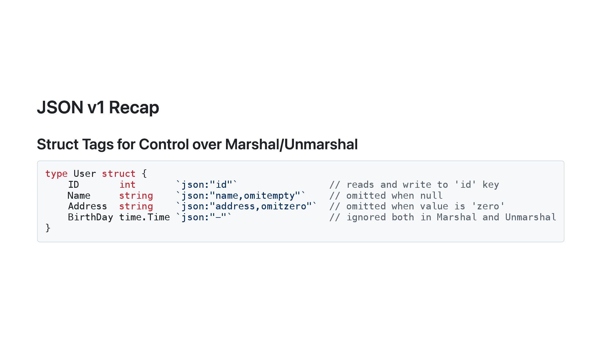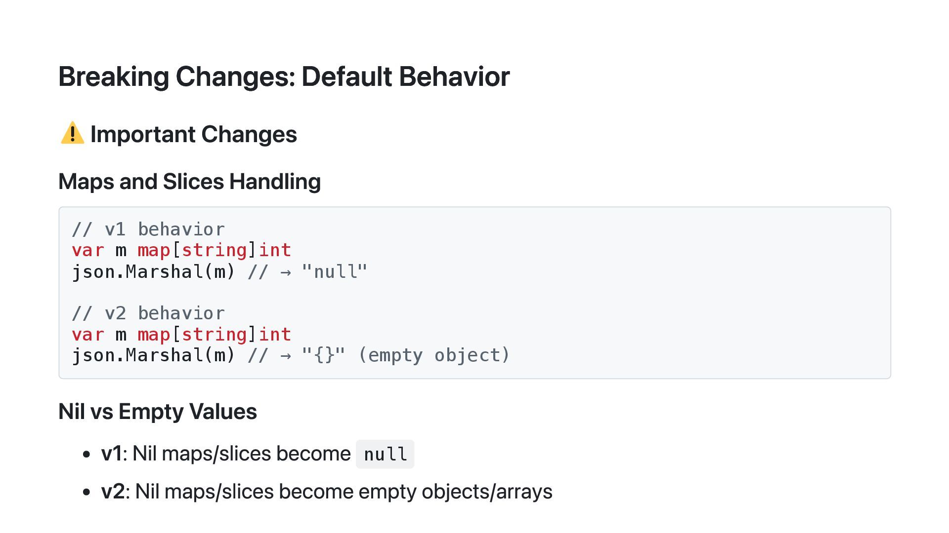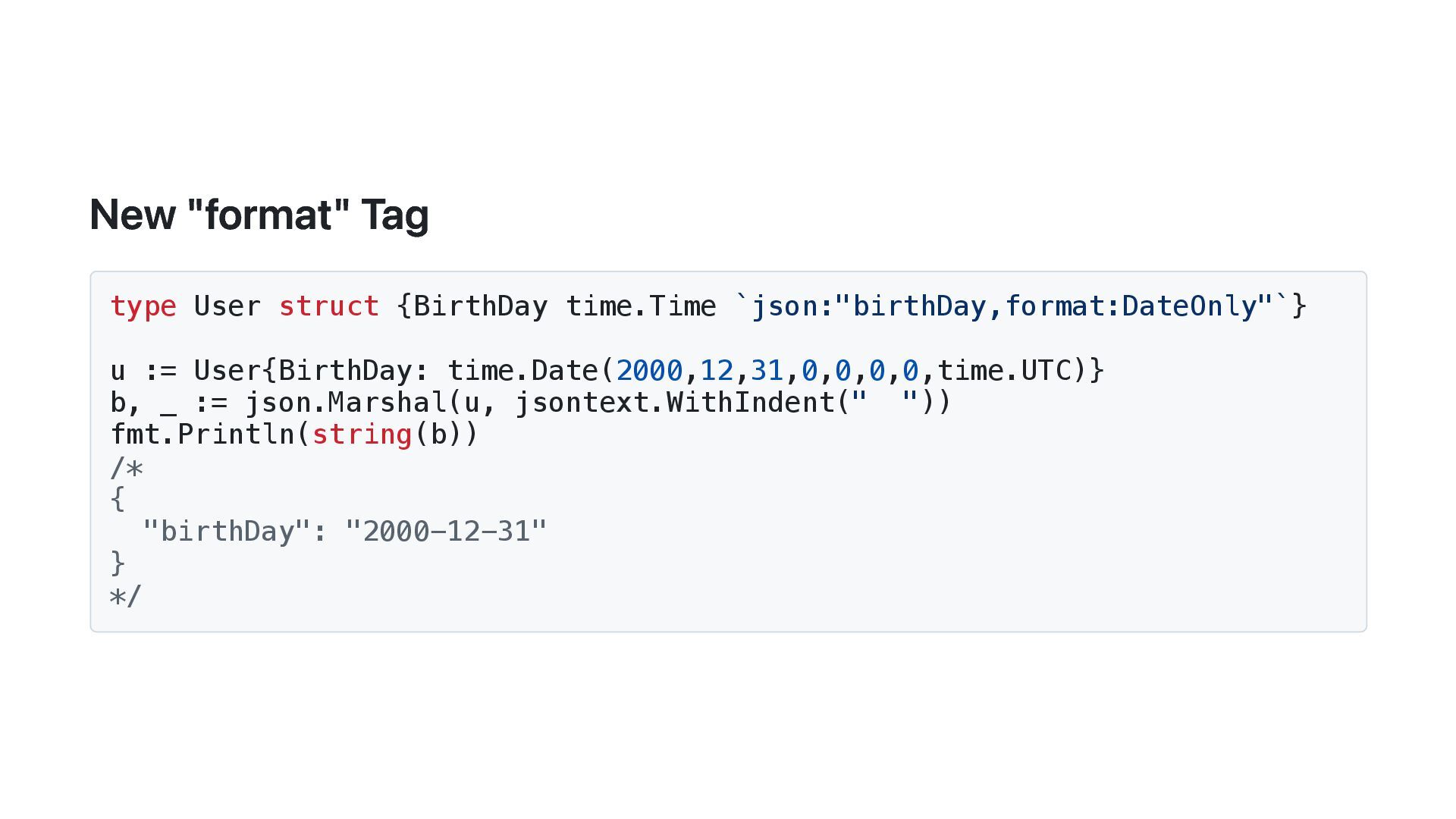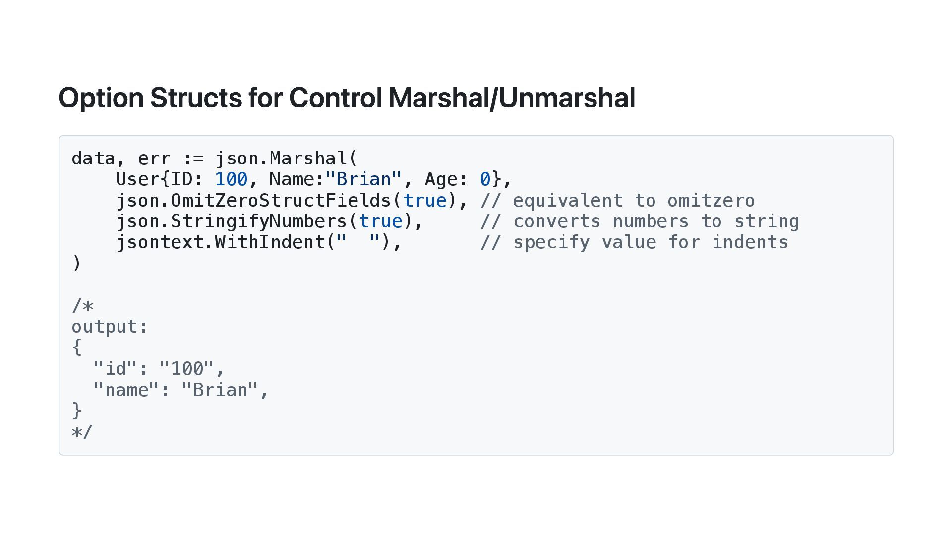 100, Name:"Brian", Age: 0}, json.OmitZeroStructFields(true), // equivalent to omitzero json.StringifyNumbers(true), // converts numbers to string jsontext.WithIndent(" "), // specify value for indents ) /* output: { "id": "100", "name": "Brian", } */