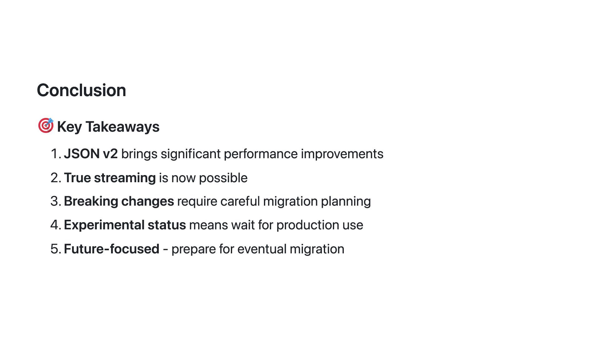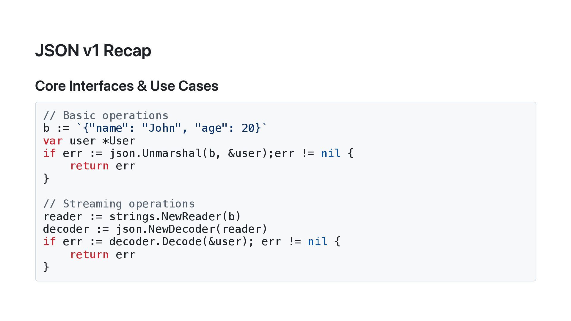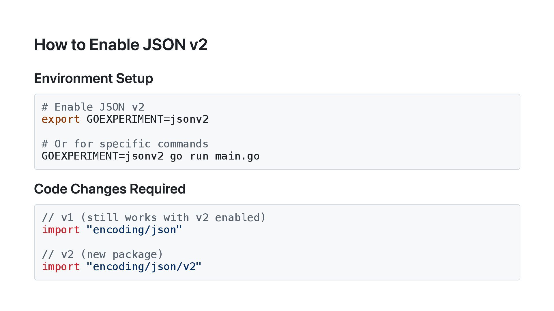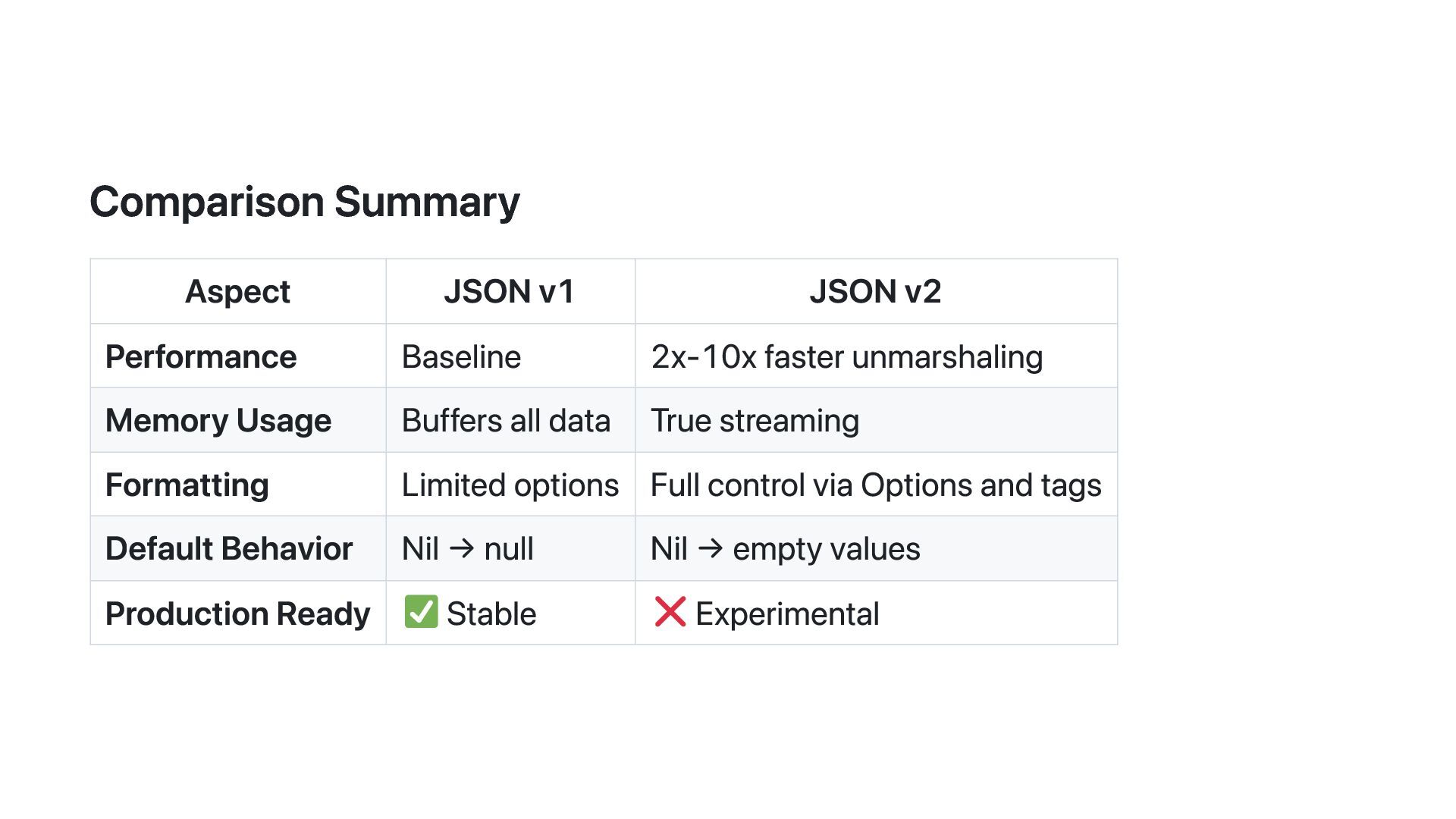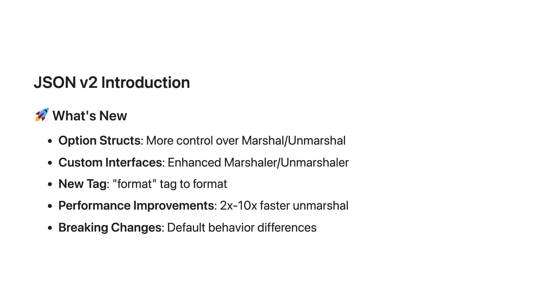 100, Name:"Brian", Age: 0}, json.OmitZeroStructFields(true), // equivalent to omitzero json.StringifyNumbers(true), // converts numbers to string jsontext.WithIndent(" "), // specify value for indents ) /* output: { "id": "100", "name": "Brian", } */