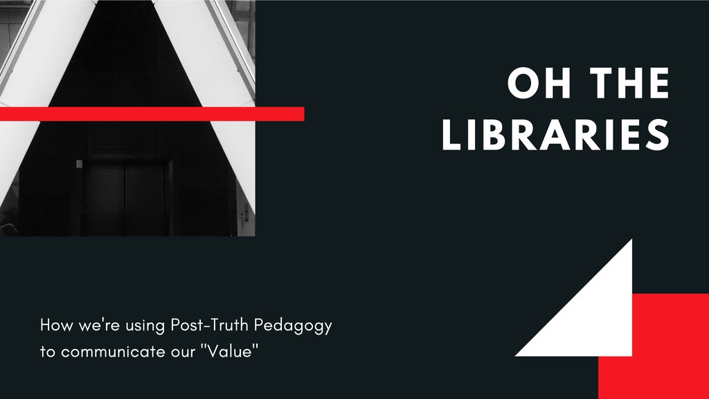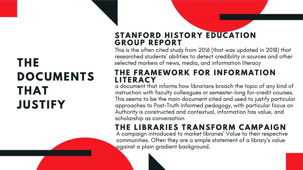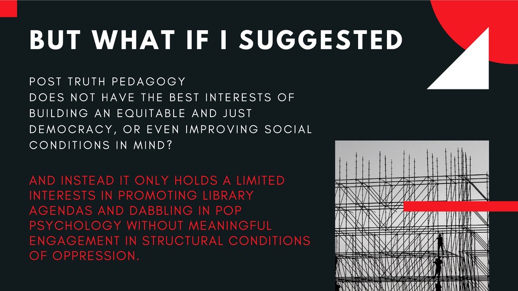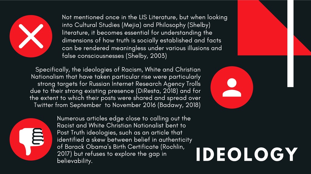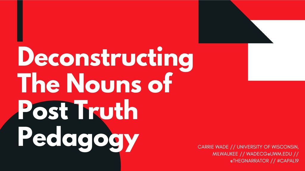 This critique of the recommended practices for “post-truth” and “fake news” pedagogy emerges from great frustration with how our profession has been so eager to take up the banner of combative language against this so-called menace—and gained some prominence in doing so—but has also reproduced non-liberatory, racist, capitalist discourse in doing so. This presentation therefore seeks to contribute to new liberatory realities for instruction and to the avoidance of future harm.