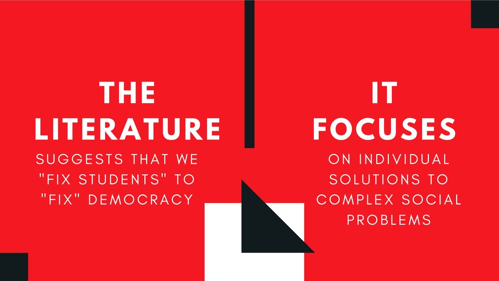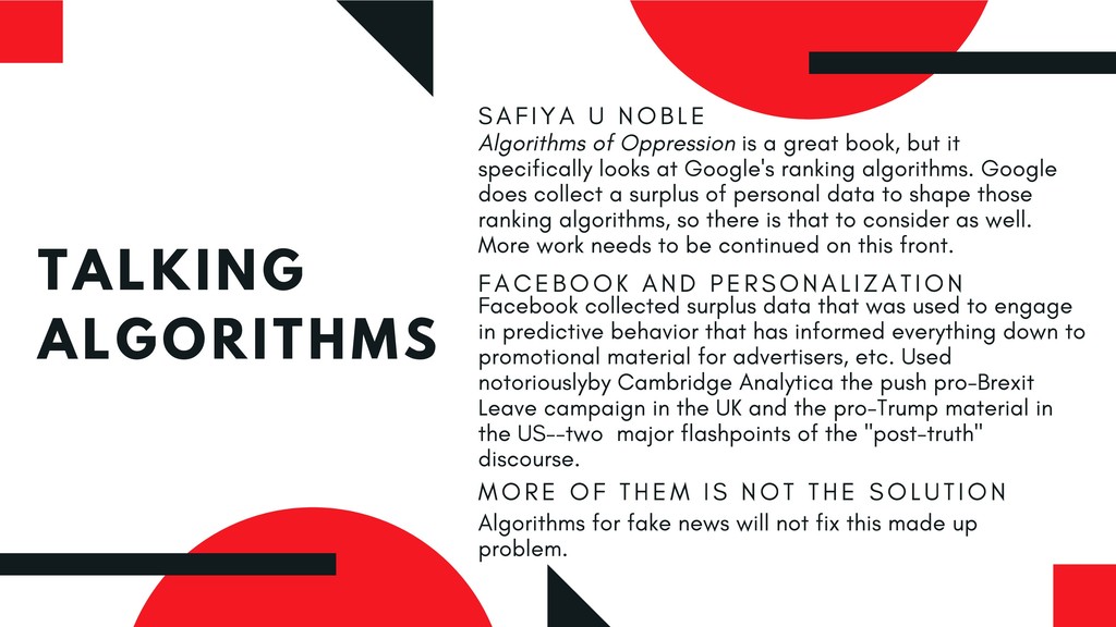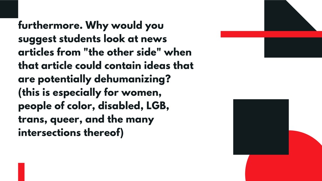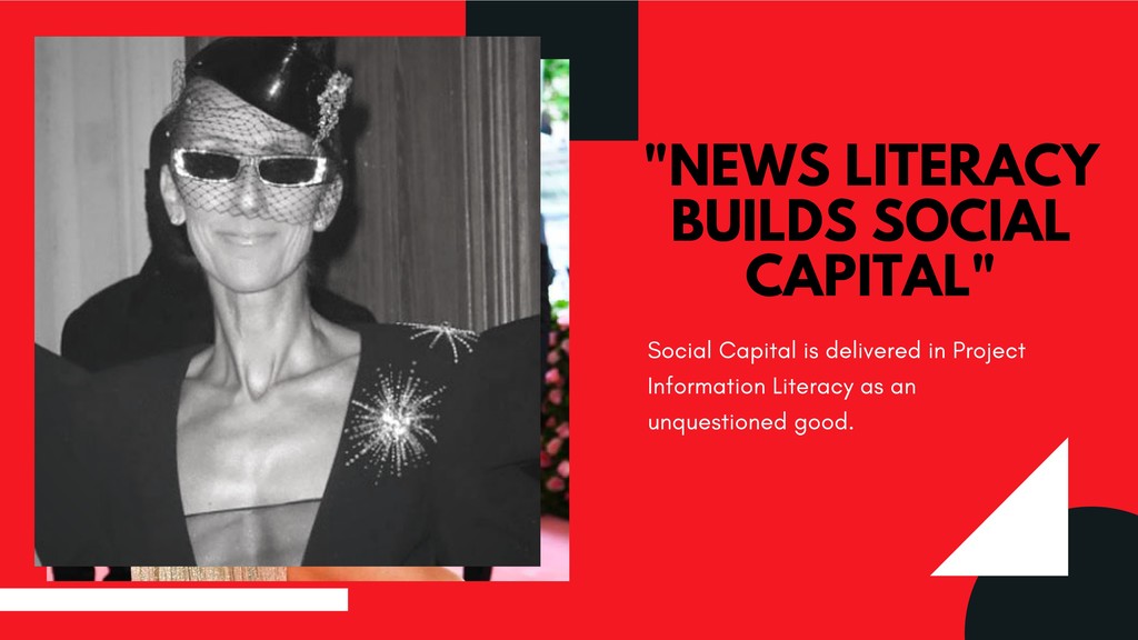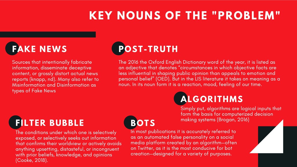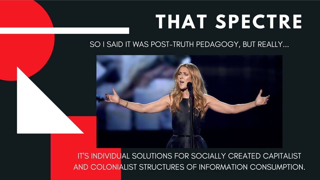 This critique of the recommended practices for “post-truth” and “fake news” pedagogy emerges from great frustration with how our profession has been so eager to take up the banner of combative language against this so-called menace—and gained some prominence in doing so—but has also reproduced non-liberatory, racist, capitalist discourse in doing so. This presentation therefore seeks to contribute to new liberatory realities for instruction and to the avoidance of future harm.