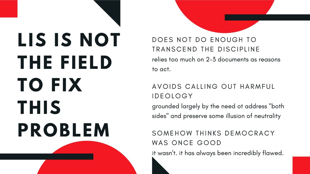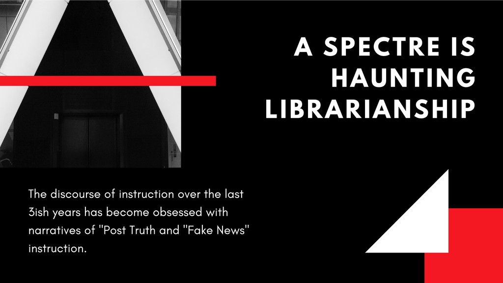 A spectre is haunting librarianship, one that my fellow panelists and I have identified as the “post-truth”/“fake news” pedagogy problem. My paper delves into the deep ramifications of our published practices and recommendations for instruction around this topic and explores what actual harm exists in the suggested approaches by librarianship to ameliorate the so-called problem of “fake news.” I argue that the harms hidden in these approaches have serious implications for both library work and the students we seek to teach and reach through library instruction.