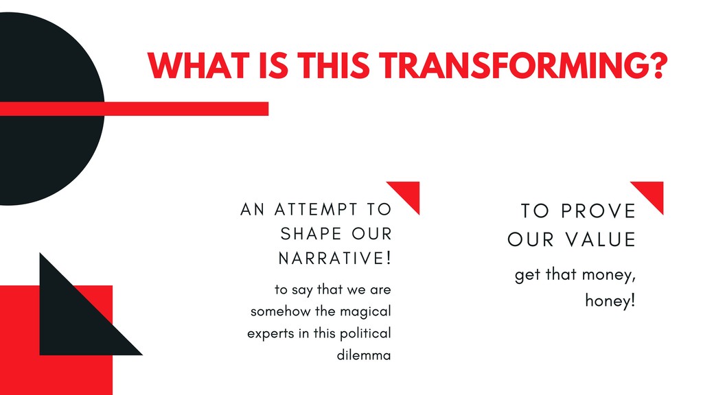 Within these networks are less obvious “nouns” and relationships—specifically the relations of value seen particularly in communications of financial need within the fiscally tightened neoliberal institutions where many of us work, the much-debated political values (or lack thereof) within the information literacy classroom, and the ways in which the profession markets both value and values to relevant parties within our institutions. Many of these nouns—both those explicit and implicit in the discourses of “post-truth” pedagogy—are deeply entangled in both market and social capitalism and in many ways only continue to bleed the historic scars of white saviorism that librarianship was built upon.