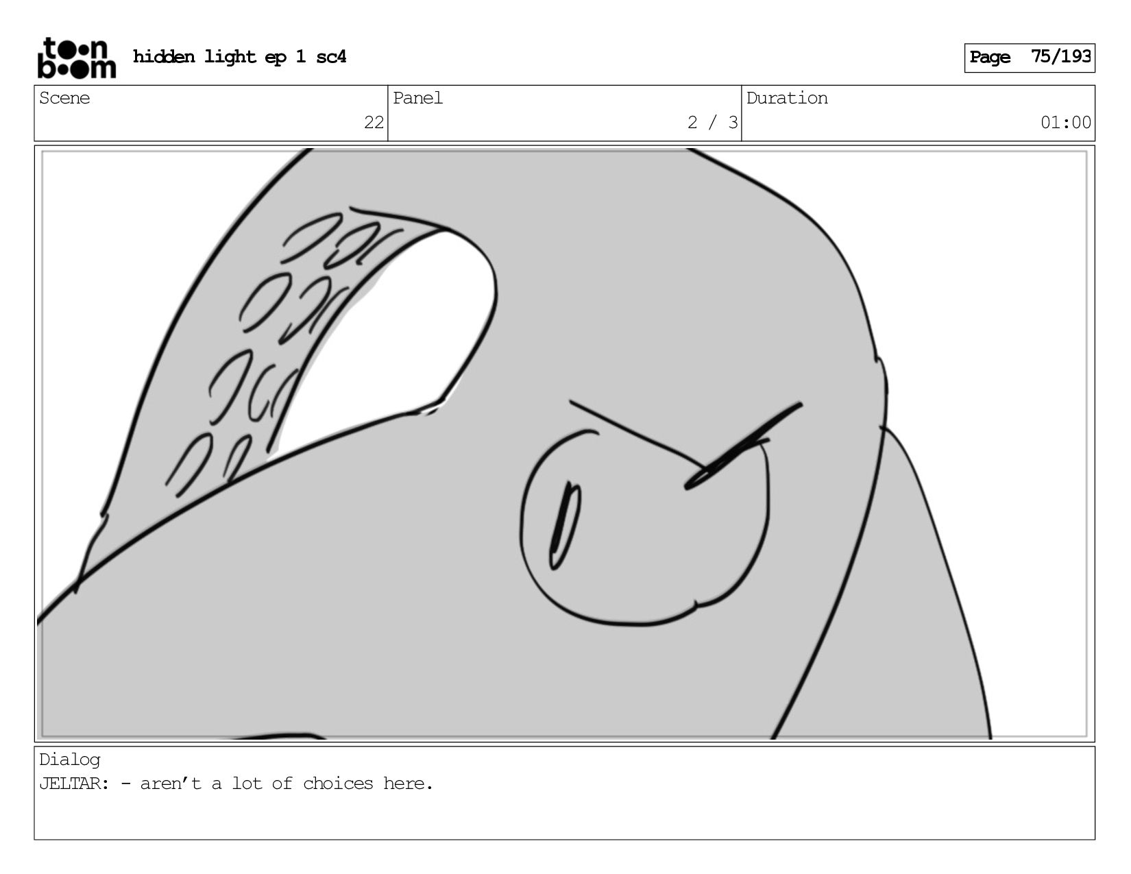 Scene 22 Panel 2 / 3 Duration 01:00 Dialog JELTAR: