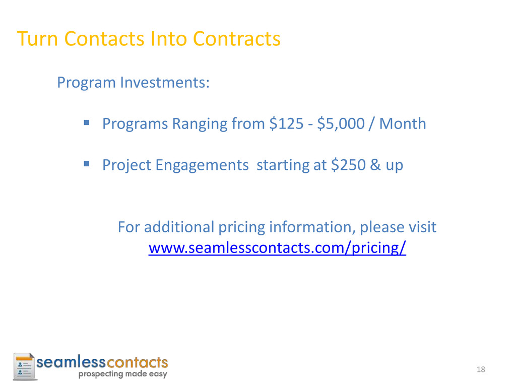 contact prospecting intelligence that you’re ever going to find. If you want to increase your meeting and close rate by 500%, work with these guys. If you don’t, your competitors will.” Oliver, Modern Office “Compared the data head to head with other providers. Seamless Contacts always provides leads that are the most data extensive, updated, customized and qualified that I have ever seen.” Andrew, AMI Publishing & Men’s Fitness “If you want to stop wasting time researching prospects or building targeted marketing lists, pick up the phone and call Seamless Contacts. They will get you everything you need.” Kris, Bare Blends Beauty