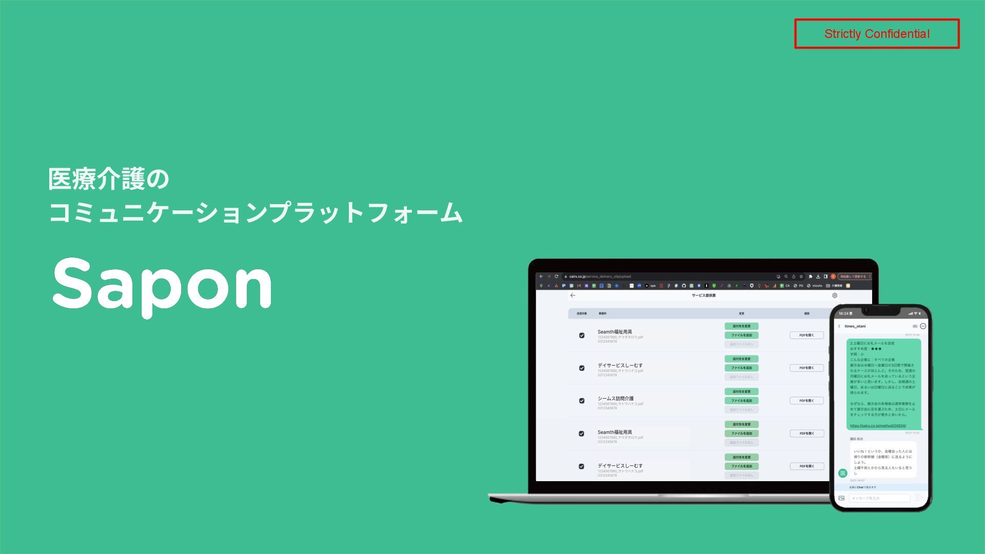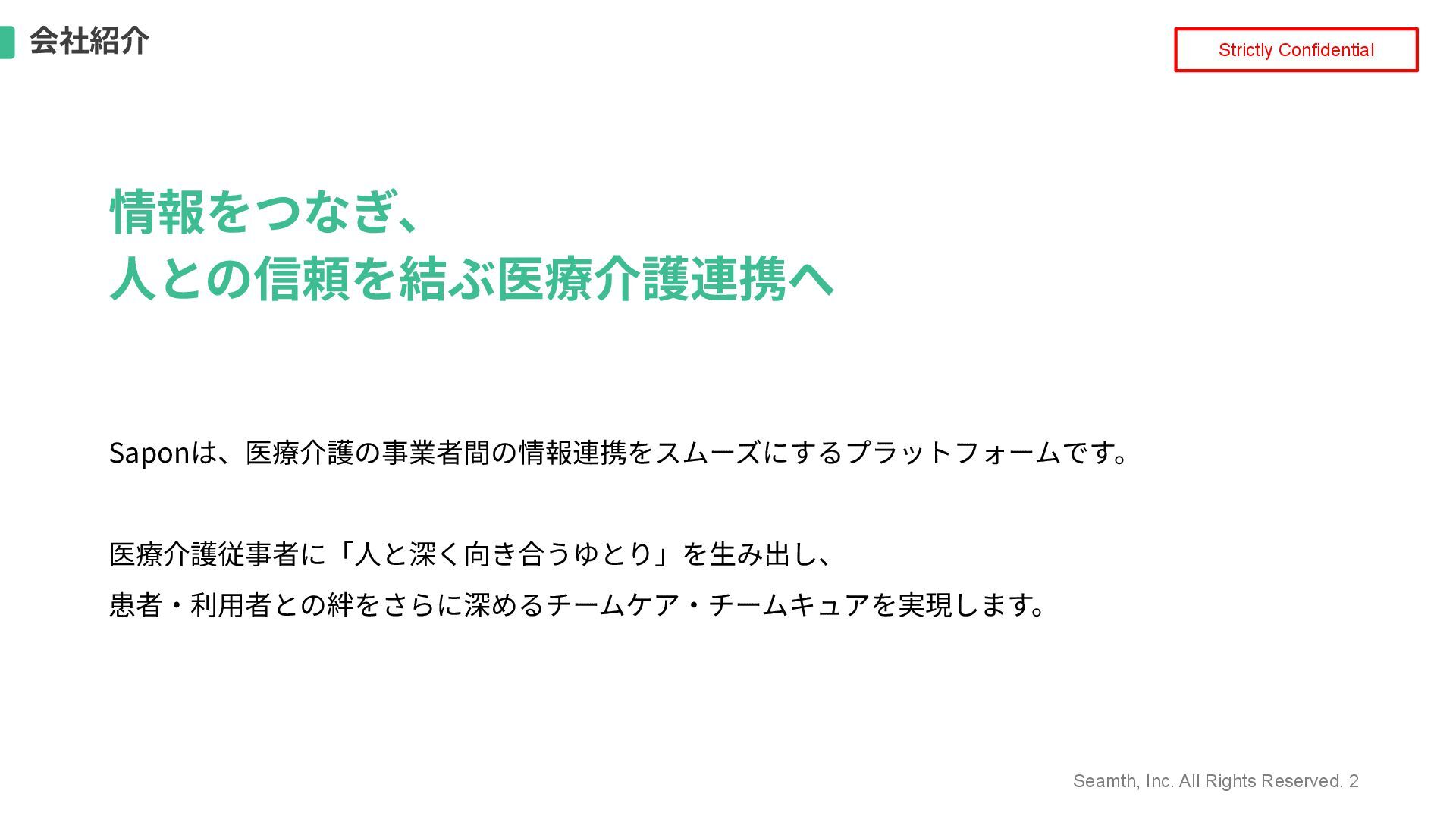 患者‧利⽤者との絆をさらに深めるチームケア‧チームキュアを実現します。 会社紹介 Strictly Confidential