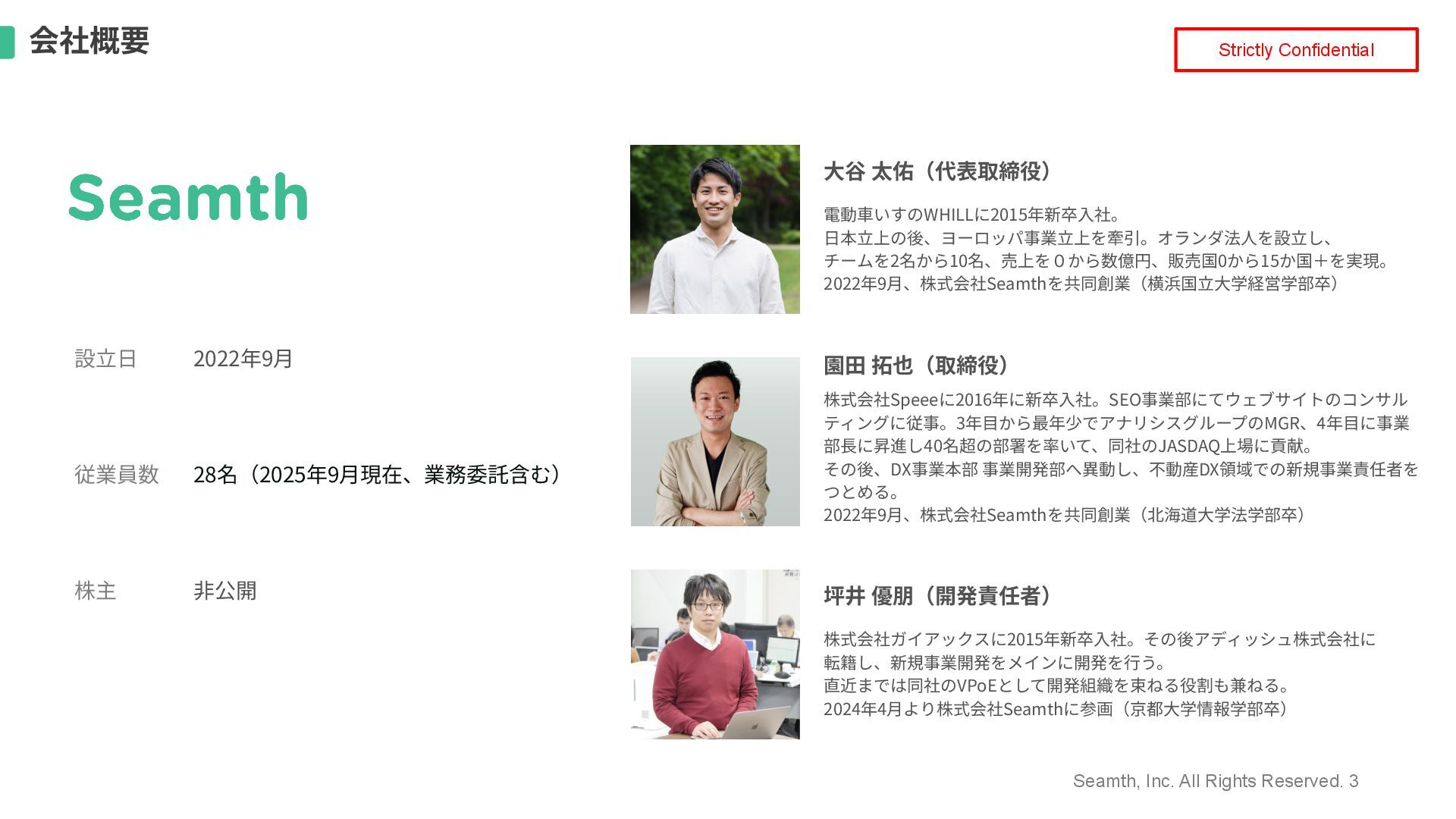 Seamth, Inc. All Rights Reserved. 3 会社概要 Strictly Confidential 設⽴⽇