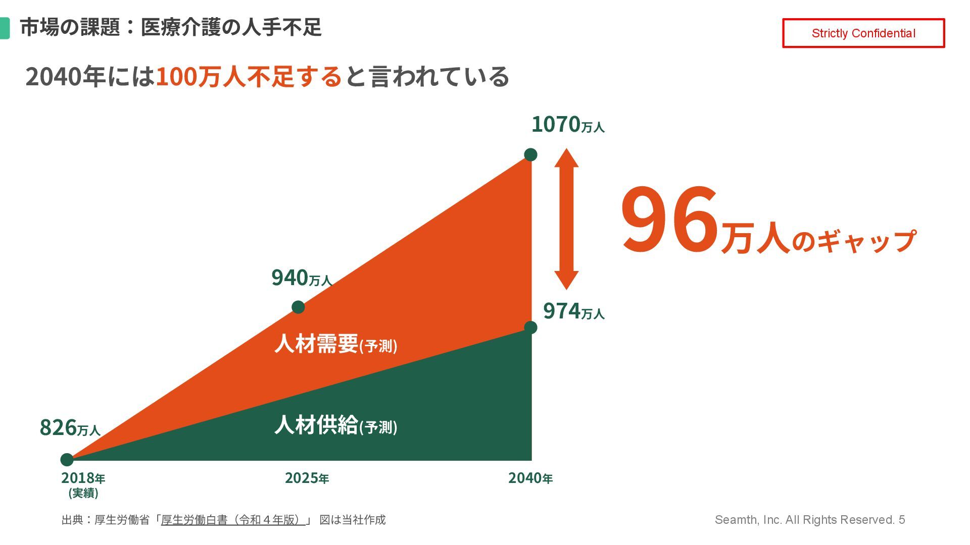 Seamth, Inc. All Rights Reserved. 5 Strictly Confidential 市場の課題:医療介護の⼈⼿不⾜ 2040年には100万⼈不⾜すると⾔われている