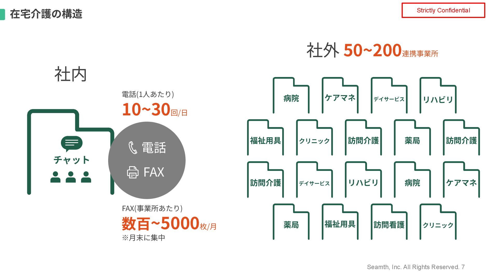 Seamth, Inc. All Rights Reserved. 6 Strictly Confidential ⼤量の⾮効率なアナログ業務 電話