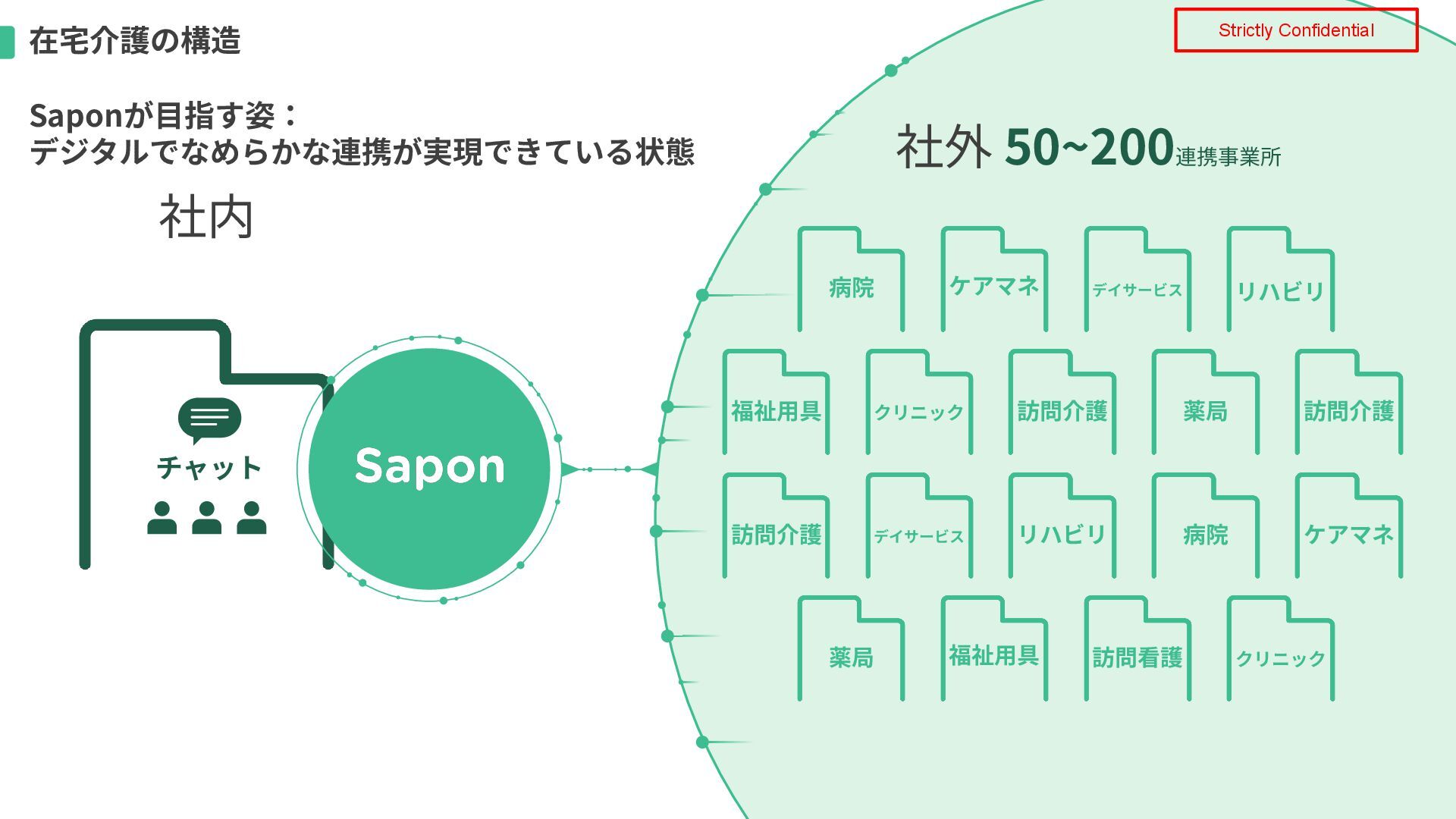 社内 福祉⽤具 クリニック 訪問介護 薬局 訪問介護 訪問介護 デイサービス リハビリ 病院 ケアマネ 薬局 福祉⽤具 訪問看護 クリニック 病院 ケアマネ デイサービス リハビリ 在宅介護の構造 社外 50~200連携事業所 Saponが⽬指す姿: デジタルでなめらかな連携が実現できている状態
