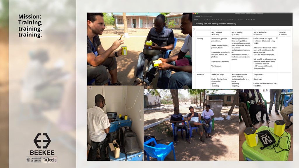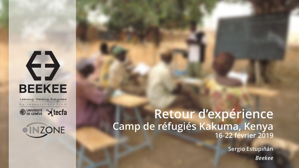 r c h e r s f r o m InZone InZone utlise des MOOCS ainsi que des cours en ligne: • Global Health (Coursera, un MOOC UNIGE) • Basic Medical Training (contenus Khan Academy, hébergé dans Moodle UNIGE) • Droits de l’Homme (Coursera, un MOOC UNIGE) • Basic Engineering (EdX Purdue University) • Arts, Sports. Parcours de formation possible en liaison avec l’université Kenyatta (Nairobi) pour un CAS issu par l’UNIGE. Aussi: certificats en Community Interpreting, Rélations Internationales chez U. Kenyatta. Suivi assuré à Genève par des collaborateurs/étudiants, y compris déplacement aux camps pour la fin des cours pour des oraux, examens, etc. Surtout via Whatsapp.