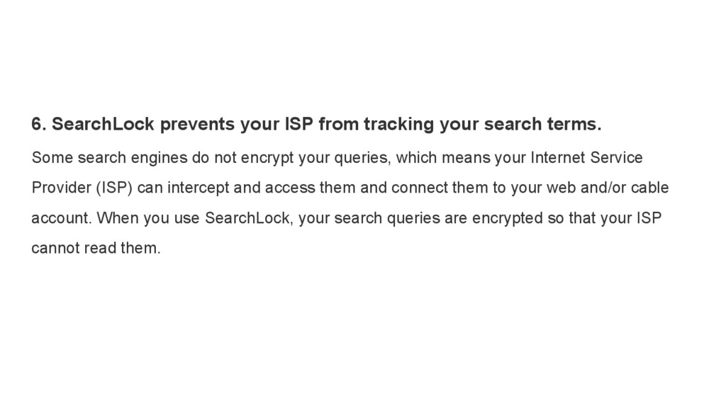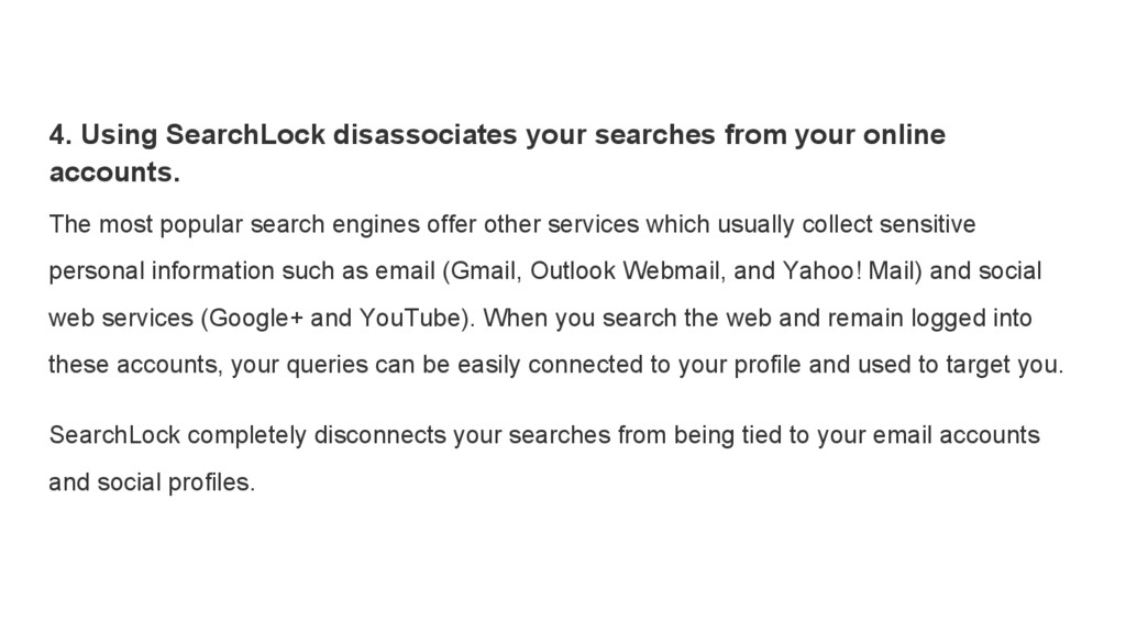 Most search engines track your searches in a way that allows them to develop a detailed profile about you so that advertisers can follow you everywhere. SearchLock acts as a shield between you and companies who intend to track you this way. The SearchLock extension detects when your search queries are headed towards a search engine that will track you, then intercepts and redirects your query to SearchLock's privacy-enhanced search results page before you are tracked.