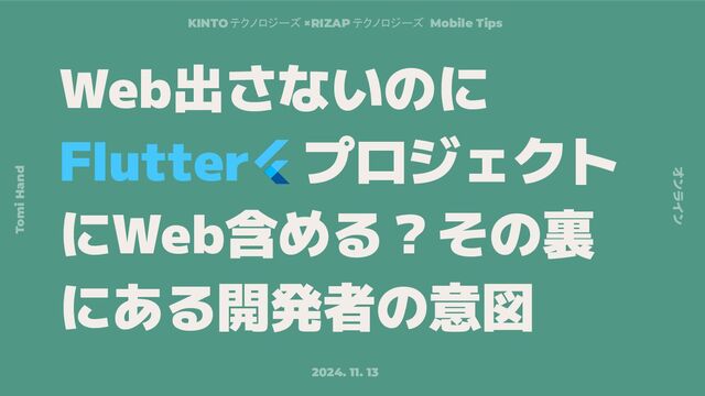Web出さないのに Flutter プロジェクト にWeb含める?その裏 にある開発者の意図 2024. 11. 13 オンライン Tomi