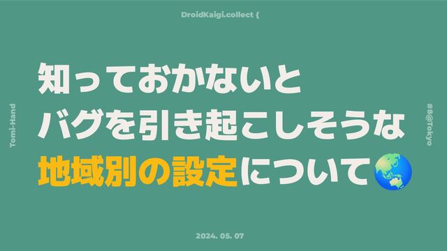 知っておかないと バグを引き起こしそうな 地域別の設定について🌏 DroidKaigi.collect { 2024. 05. 07 #8@Tokyo Tomi-Hand