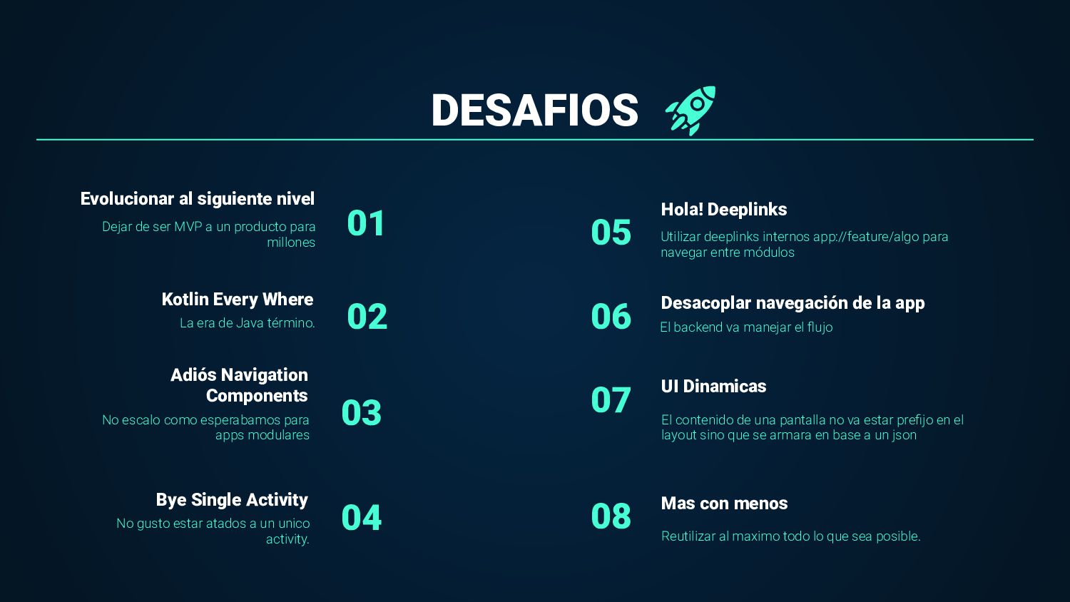 El backend va manejar el flujo 06 El contenido de una pantalla no va estar prefijo en el layout sino que se armara en base a un json Dejar de ser MVP a un producto para millones 01 No escalo como esperabamos para apps modulares 03 No gusto estar atados a un unico activity. 04 Evolucionar al siguiente nivel Adiós Navigation Components Bye Single Activity Hola! Deeplinks Desacoplar navegación de la app La era de Java término. 02 Kotlin Every Where 07 UI Dinamicas Reutilizar al maximo todo lo que sea posible. 08 Mas con menos