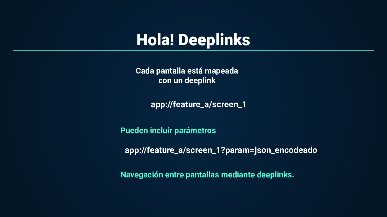 Pueden incluir parámetros app://feature_a/screen_1?param=json_encodeado Navegación entre pantallas mediante deeplinks.