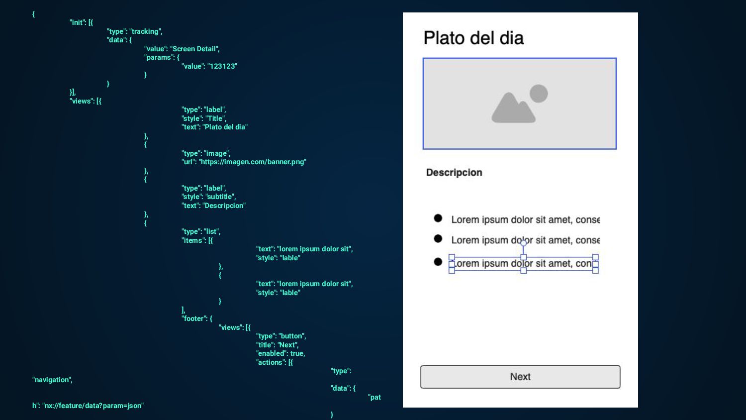 "params": { "value": "123123" } } }], "views": [{ "type": "label", "style": "Title", "text": "Plato del dia" }, { "type": "image", "url": "https://imagen.com/banner.png" }, { "type": "label", "style": "subtitle", "text": "Descripcion" }, { "type": "list", "items": [{ "text": "lorem ipsum dolor sit", "style": "lable" }, { "text": "lorem ipsum dolor sit", "style": "lable" } ], "footer": { "views": [{ "type": "button", "title": "Next", "enabled": true, "actions": [{ "type": "navigation", "data": { "pat h": "nx://feature/data?param=json" }