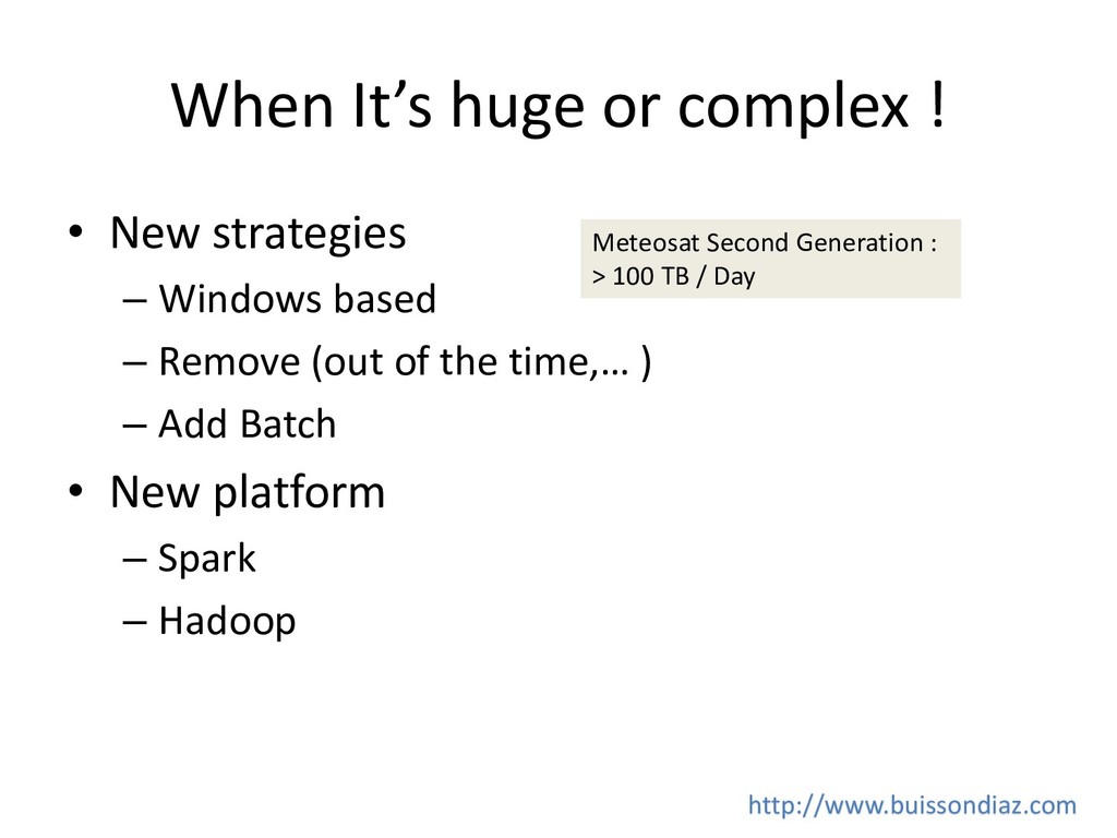Windows based – Remove (out of the time,… ) – Add Batch • New platform – Spark – Hadoop Meteosat Second Generation : > 100 TB / Day http://www.buissondiaz.com