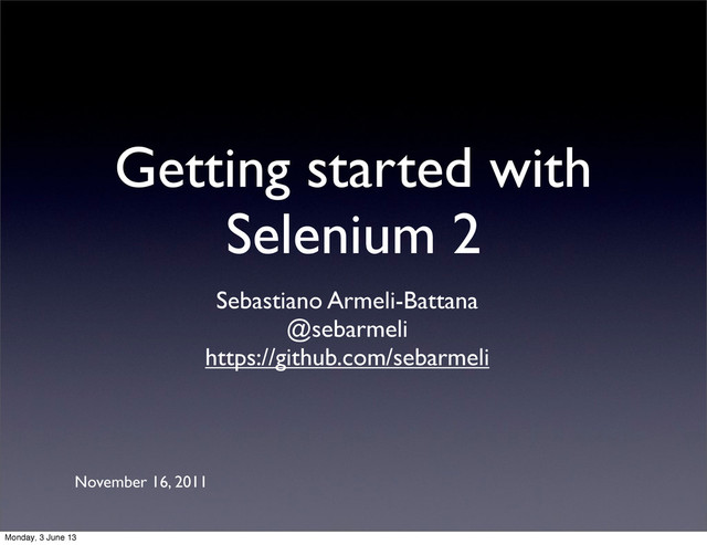 • Class name webDriver.findElements(By.className("sponsor_logos")); • CSS Selector webDriver.findElement(By.cssSelector("section#sponsor>p")); • XPath webDriver.findElement(By.xpath("//section[@id=‘miniconfs’]/a[2]")); • Link Text webDriver.findElements(By.linkText("About")); • Partial Link Text webDriver.findElement(By.partialLinkText("visitcanberra")); Locator Strategies Monday, 3 June 13