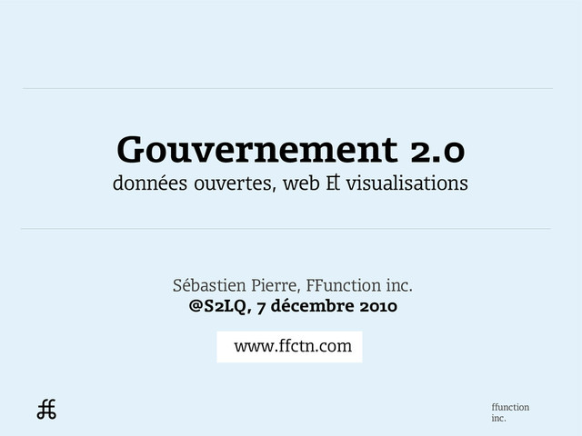 open-source en 1998 GOUVERNEMENT 2.0 Système de gestion de tickets pour la ville de Dieppe Visualiseur de dépenses fédérales DONNÉES OUVERTES Co-fondateur de Montréal Ouvert ENTREPRENEUR FFunction, visualisation de données