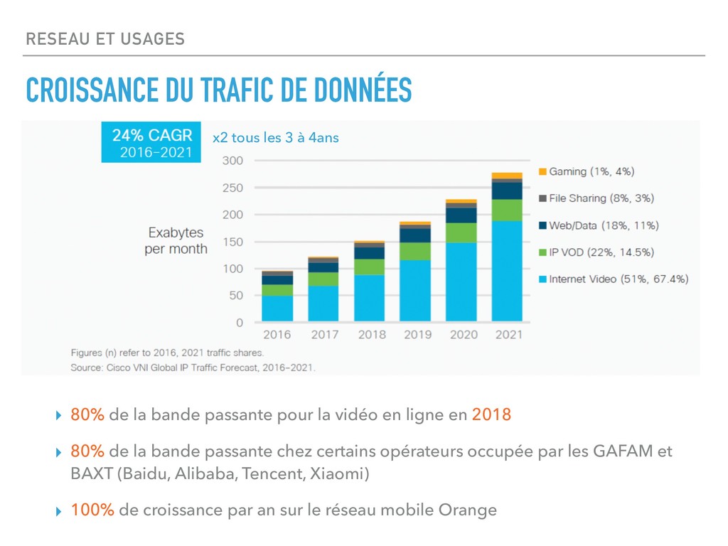 LA CONSOMMATION Source : (Cisco, 2017b) Nombre d’équipements connectés par personne 2016 2021 Croissance annuelle Asie-Pacifique 1,9 2,9 8,3 % Europe centrale et orientale 2,5 3,8 9,1 % Amérique latine 2,1 2,9 7,0 % Moyen-Orient et Afrique 1,1 1,4 5,4 % Amérique du Nord 7,7 12,9 11,0 % Europe de l'Ouest 5,3 8,9 10,9 % Global 2,3 3,5 8,5 % Regional split 2016 Population