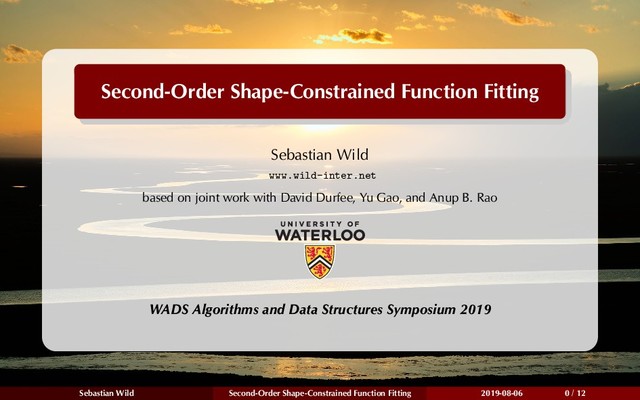 , fi − fi−1 ) : ∃(f1 , . . . , fi−2 ) ∀j i (Xj ), (Yj ), (Zj ) = (fi , fi − fi−1 ) : ∃fi−2 (fi−1 , fi−1 − fi−2 ) ∈ Pi−1 , (Xi ), (Yi ), (Zi ) = (x, y) : x ∈ [x− i , x+ i ], y ∈ [y− i , y+ i ], ∃u (x − y, u) ∈ Pi−1 , y − u ∈ [z− i , z+ i ] 1 Only z-constraints: Pi−1 P(z) i P(z) i = (x, y) : x ∈ [x− i , x+ i ], y ∈ [y− i , y+ i ], ∃u (x − y, u) ∈ Pi−1 , y − u ∈ [z− i , z+ i ] = (x + y + z, y + z) : (x, y) ∈ Pi−1 , z ∈ [z− i , z+ i ] (1.7, 0) (2, 0) (2.2, 0.2) (2.2, 1) (2, 1) (1.7, 0.7) Pi−1 horizontal shear (1.7, 0) (2, 0) (2.4, 0.2) (3.2, 1) (3, 1) (2.4, 0.7) slide along x = y + z + z z − 4 = − 0.8 z + 4 = − 0.2 (0.9, −0.8) (1.2, −0.8) (1.6, −0.6) (3, 0.8) (2.8, 0.8) (2.2, 0.5) P(z) i Sebastian Wild Second-Order Shape-Constrained Function Fitting 2019-08-06 8 / 12