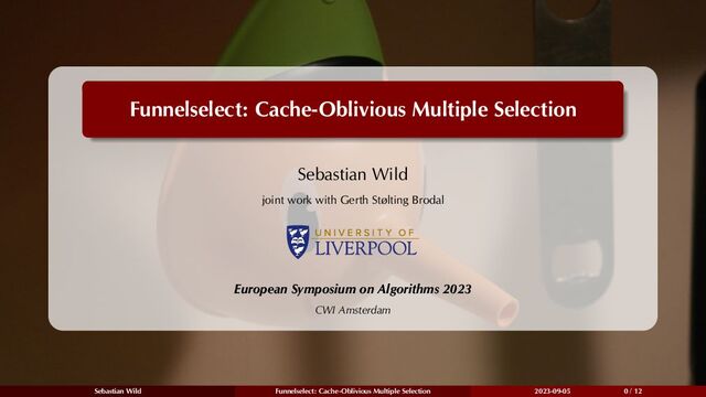 r1 < r2 < · · · < rq from unsorted elements here: all distinct x1 , . . . , xN ⇝ Report sought elements x(r1) , . . . , x(rq) in sorted order Example: 67 x1 30 x2 45 x3 33 x4 15 x5 99 x6 26 x7 90 x8 55 x9 9 x10 96 x11 45 x12 95 x13 31 x14 3 x15 3 1 9 2 15 3 26 4 30 5 31 6 33 7 45 8 45 9 55 10 67 11 90 12 95 13 96 14 99 15 r1 = 1 r2 = 2 r3 = 3 r4 = 8 Answer: 3, 9, 15, 45 Simple algorithms: 1 q calls to selection algorithm (quickselect, median of medians) ⇝ O(Nq) 2 Divide & conquer 1: (single) select r⌈q/2⌉ -th smallest and partition x1 , . . . , xN around it. Recursively select r1 , . . . , r⌈q/2⌉−1 and r⌈q/2⌉+1 , . . . , rq ⇝ O(N lg q) 3 Divide & conquer 2: Find median of x1 , . . . , xN and split query ranks. Recurse where subproblem contains query ranks. ⇝ O(N lg q) Sebastian Wild Funnelselect: Cache-Oblivious Multiple Selection 2023-09-05 2 / 12