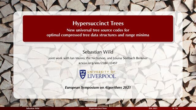 µ1 , . . . , µm with |DS (µi )| ∼ lg(1/|PS [µi ]) 1 store |µi| Elias code 2 store left subtree sizes in depth-first traversal using arithmetic coding 2a Encode sequence of outcomes as subinterval I of [0, 1) = I0 Know subtree_size(v1 ) = |µi | = 5 (from 1 ) for v1 , left subtree size ℓ1 ∈ {0, 1, 2, 3, 4} identify with subintervals of I0 of lengths p(ℓ1 , 4 − ℓ1 )|I0 | = 1 5 here ℓ1 = 3 I1 = [3 5 , 4 5 ) know subtree_size(v2 ) = ℓ1 = 3 left subtree size ℓ2 ∈ {0, 1, 2} use subintervals of I1 of lengths p(ℓ1 , 2 − ℓ1 )|I1 | = 1 3 · 1 5 here ℓ2 = 1, I2 = [3 5 + 1 15 , 3 5 + 2 15 ) = [2 3 , 11 15 ) subtree_size(v3 ) = ℓ2 = 1, so ℓ3 = 0. nothing to store! v4 and v5 same I = [2 3 , 11 15 ) v1 v2 v3 v4 v5 2b Arithmetic coding: Find interval [ m 2l , m+1 2l ) ⊆ I (l, m ∈ N) Here: [22 32 , 23 32 ) encode I by l-bit binary representation of m. Here: 10110 Always have l lg(1/|I|) + 2 Sebastian Wild Hypersuccinct Trees ESA 2021 14 / 24