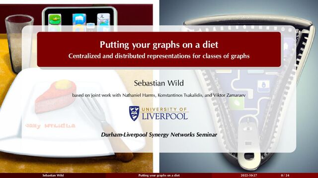define 1 A succinct encoding of F: encode : F → {0, 1}∗, decode : {0, 1}∗ → F lossless: decode(encode(G)) = G for G ∈ F. succinct: G ∈ Fn |encode(G)| = log 2 (|Fn|)·(1+o(1)) efficient: encode, decode efficiently computable (say polytime) 2 A succinct data structure for F (for adjacency): succinct encoding plus adjacency-list queries adjacent(v, u): 1 if vu ∈ E(G) else 0 nextNeigbor(v, u): successor of u in v’s adj list computable efficiently on word-RAM say o(log(|Fn|)) time; often O(1) (potentially more queries) 3 A succinct labeling scheme for F (for adjacency): : V(G) → {0, 1}∗, labelAdj : {0, 1}∗ × {0, 1}∗ → {0, 1} labelAdj( (v), (u)) = adjacent(v, u) for v, u ∈ V(G). succinct: G ∈ Fn | (v)| 1 n log 2 (|Fn|)(1 + o(1)) weaker version: compact: | (v)| = O( 1 n log 2 (|Fn|)) (labels and decoder can differ for each G ∈ F, but heredity puts limits on that) Sebastian Wild Putting your graphs on a diet 2022-10-27 3 / 24