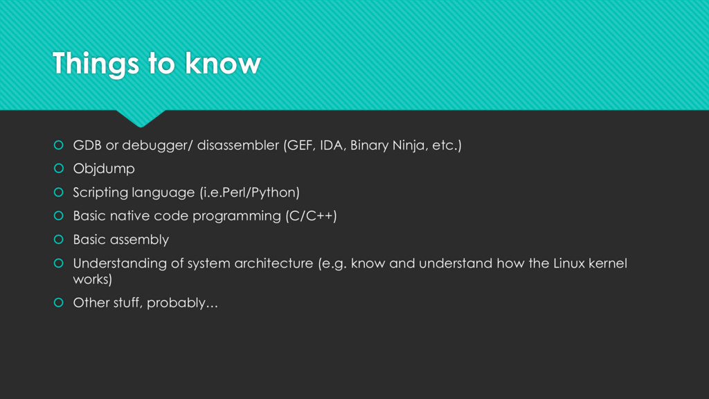 This presentation covers the fundamentals of 32bit binary exploits (focusing on the IA32 architecture) by means of logic abuse, overflows, and code injection. The goal is to arm you with basic knowledge of processor architectures and code review skills that will allow you to spot bugs and craft exploits for vulnerable executable.