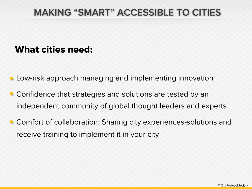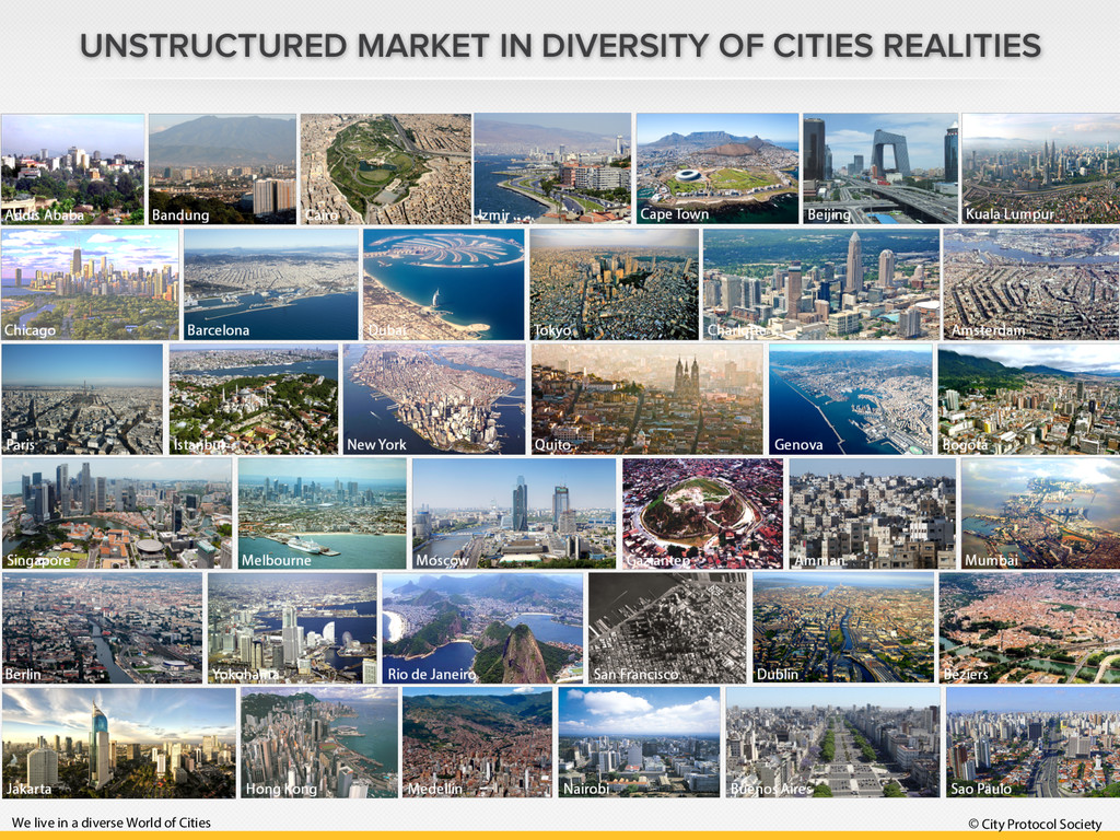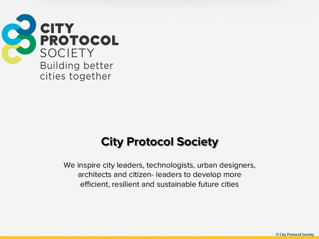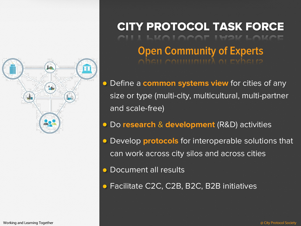 Protocol Society Working and Learning Together Define a common systems view for cities of any size or type (multi-city, multicultural, multi-partner and scale-free) Do research & development (R&D) activities Develop protocols for interoperable solutions that can work across city silos and across cities Document all results Facilitate C2C, C2B, B2C, B2B initiatives