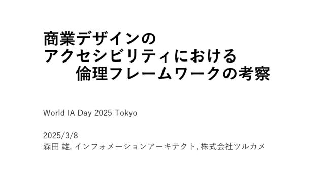 World IA Day 2025 Tokyo (2025年3月8日開催) https://www.worldiaday.org/events/tokyo/2025 上記イベントの話題提供2「商業デザインのアクセシビリティにおける倫理フレームワークの考察」にて使用したスライドを公開用に編集したものです。