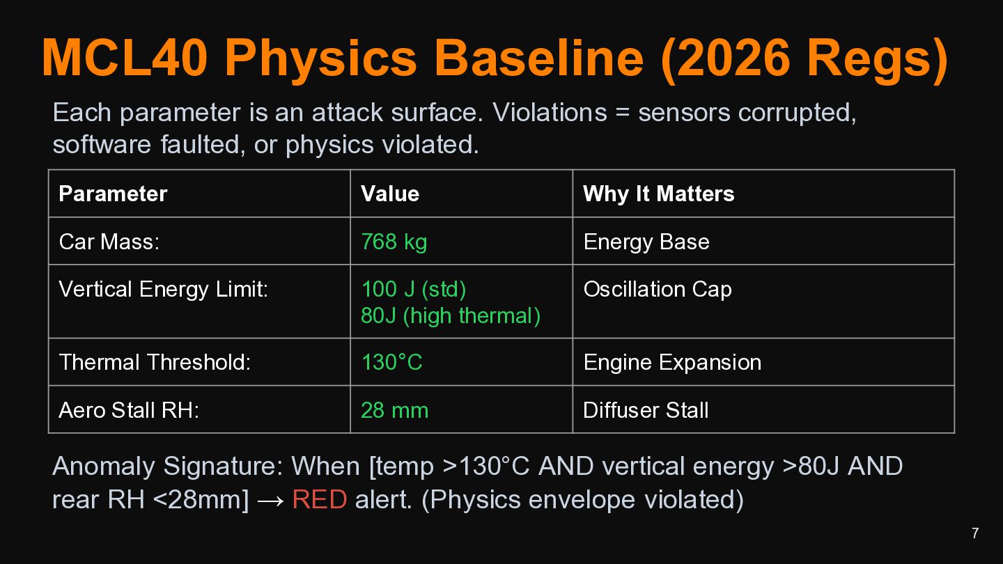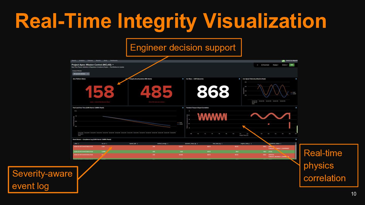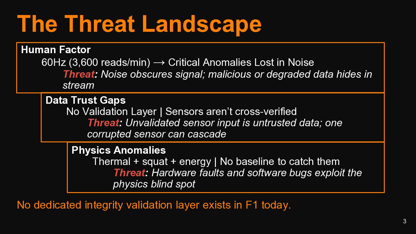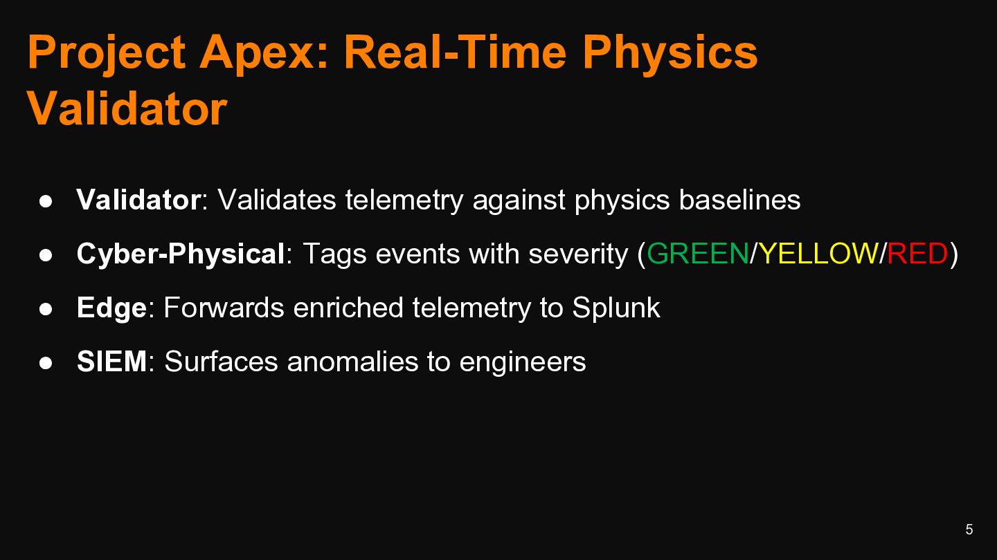 Formula 1's 2026 technical regulations introduced a 50:50 hybrid power unit architecture that created an attack surface spanning thermal, electrical, and software interdependencies simultaneously. Project Apex addresses the resulting integrity gap: a real-time, physics-aware validation layer that classifies every telemetry event against MCL40's physical envelope, assigns a deterministic severity level, and surfaces anomalies to engineers in under 10 milliseconds - before a sensor fault, software bug, or adversarial input can propagate into a safety-critical decision.