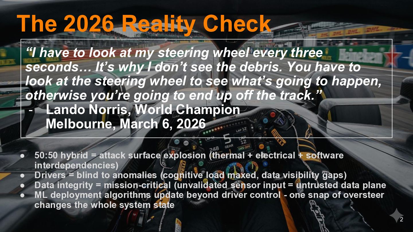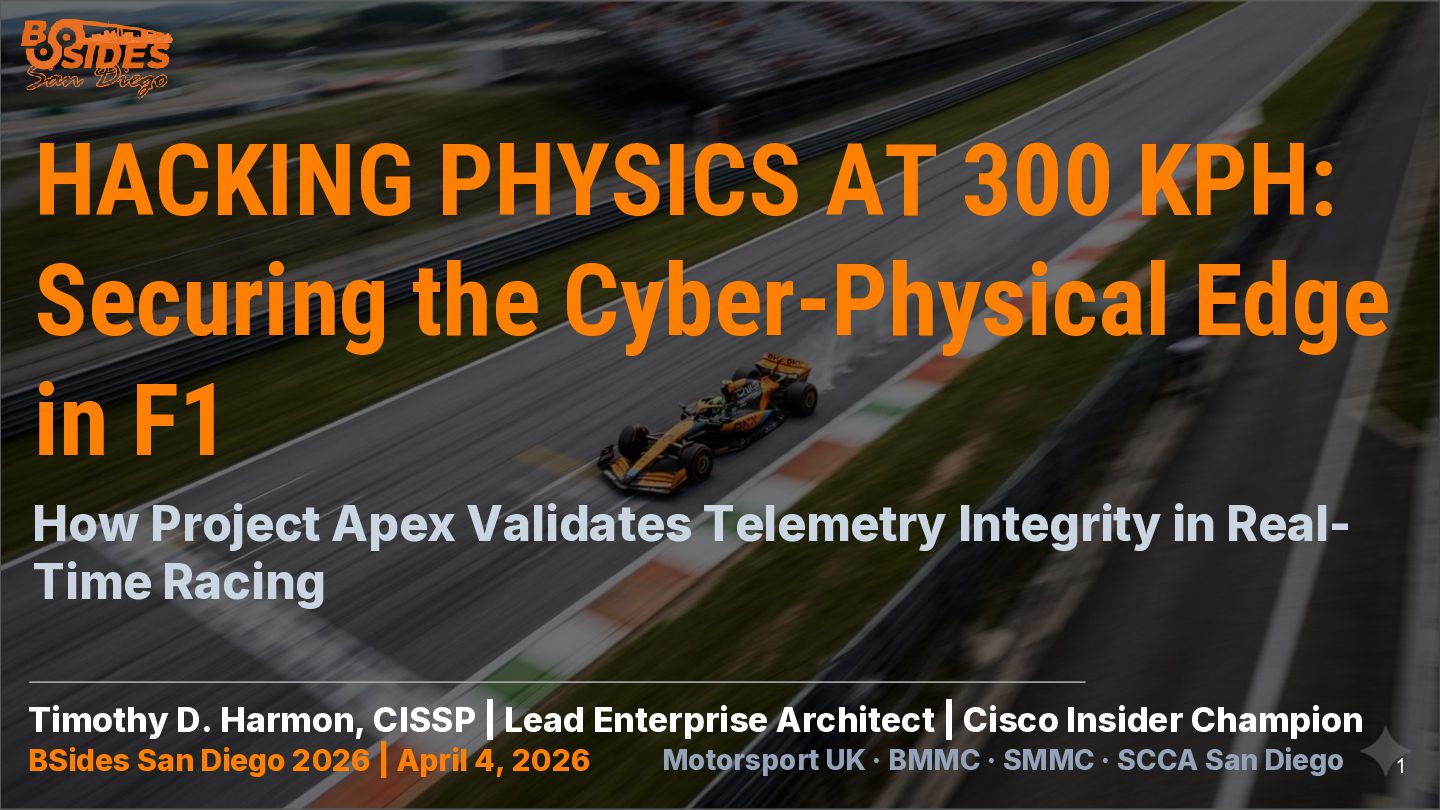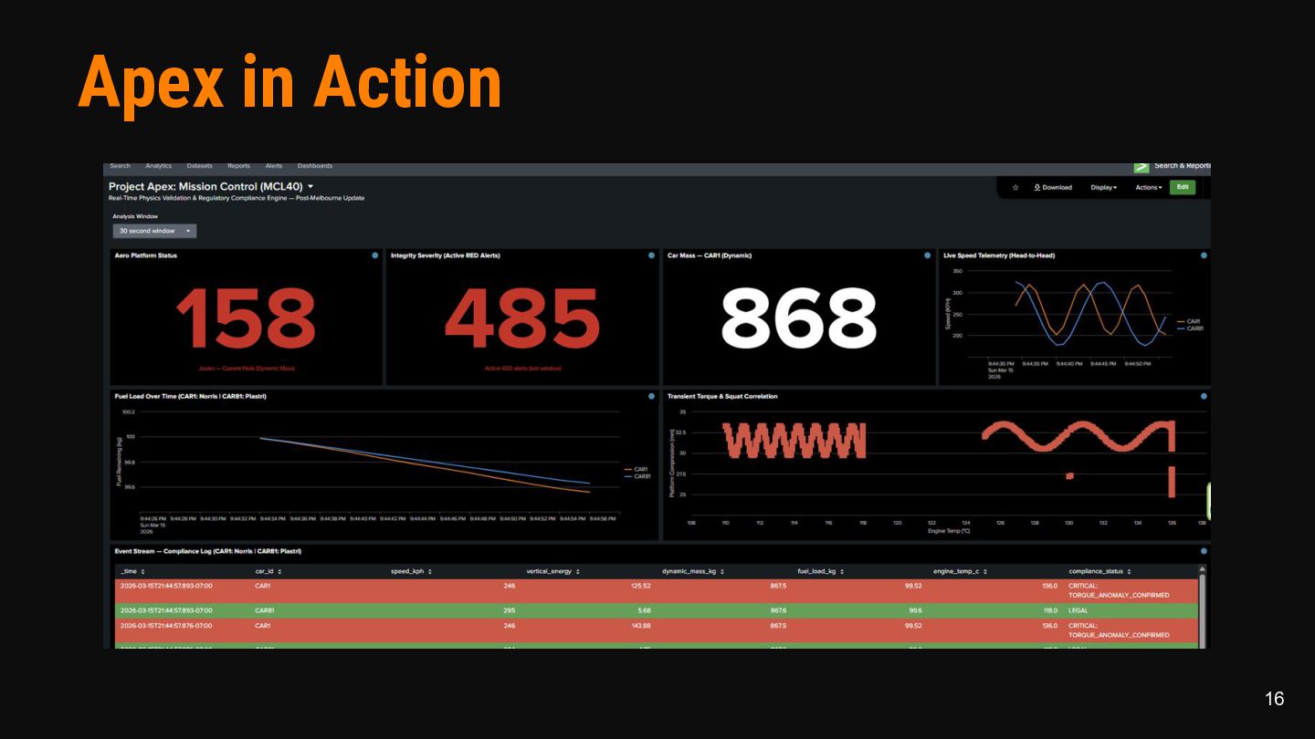 Formula 1's 2026 technical regulations introduced a 50:50 hybrid power unit architecture that created an attack surface spanning thermal, electrical, and software interdependencies simultaneously. Project Apex addresses the resulting integrity gap: a real-time, physics-aware validation layer that classifies every telemetry event against MCL40's physical envelope, assigns a deterministic severity level, and surfaces anomalies to engineers in under 10 milliseconds - before a sensor fault, software bug, or adversarial input can propagate into a safety-critical decision.