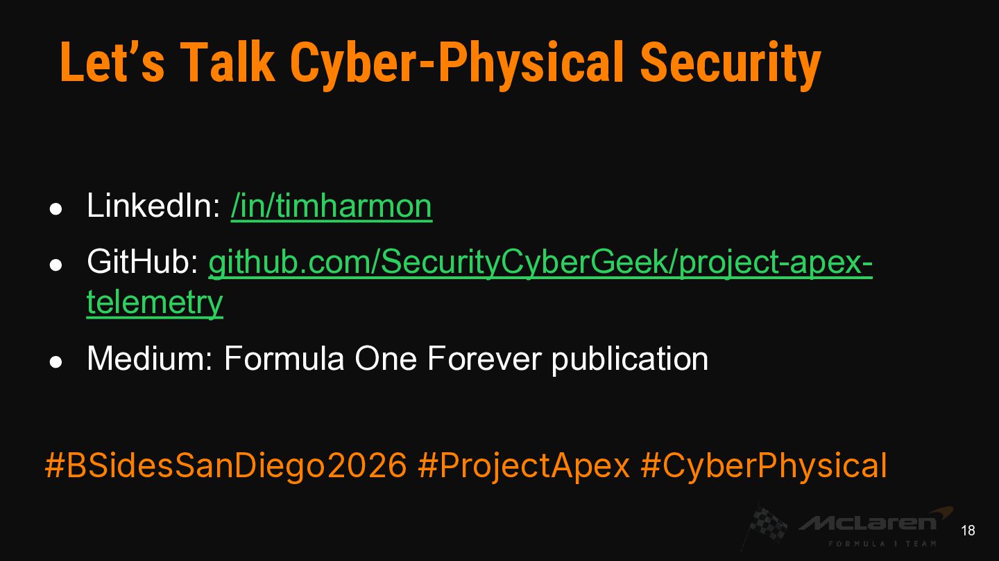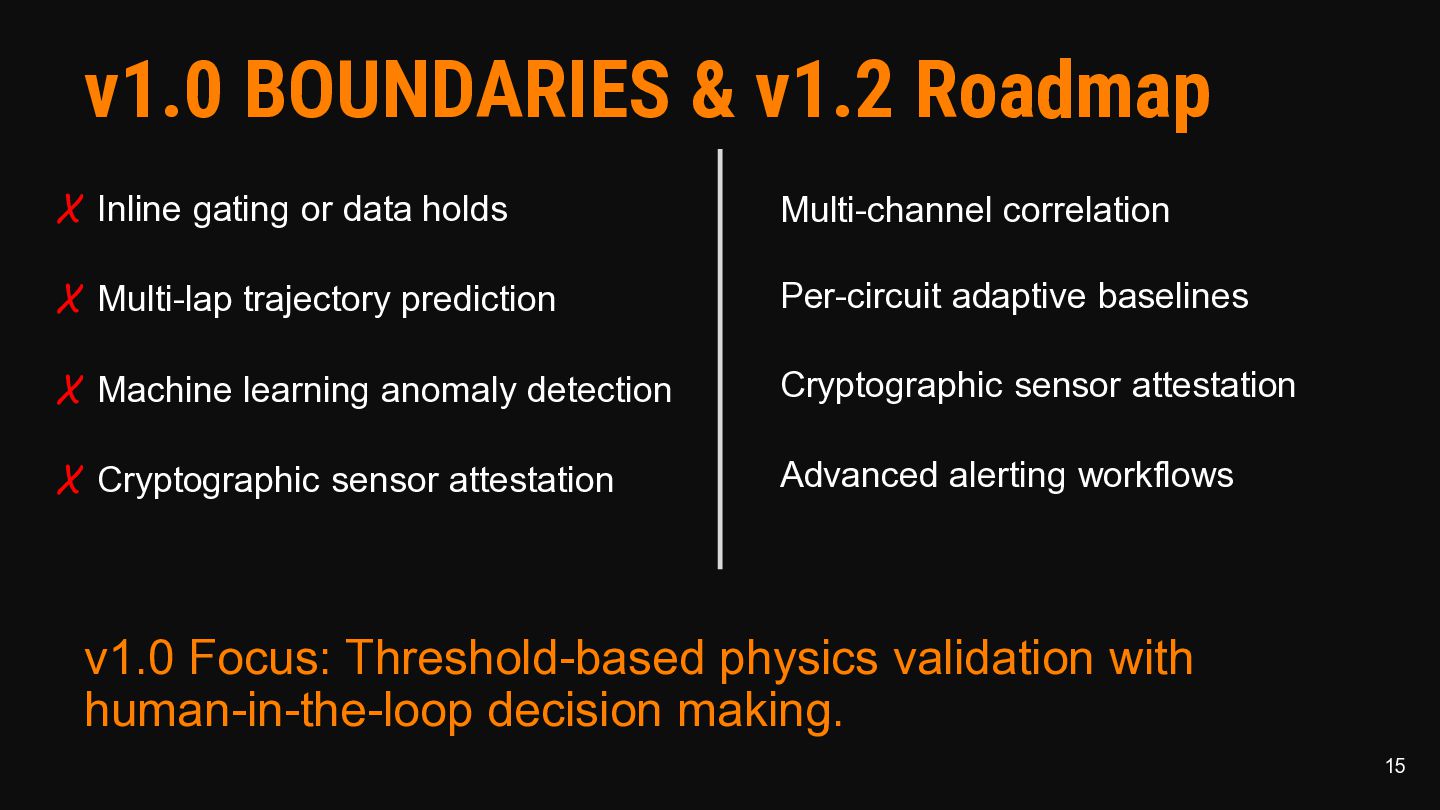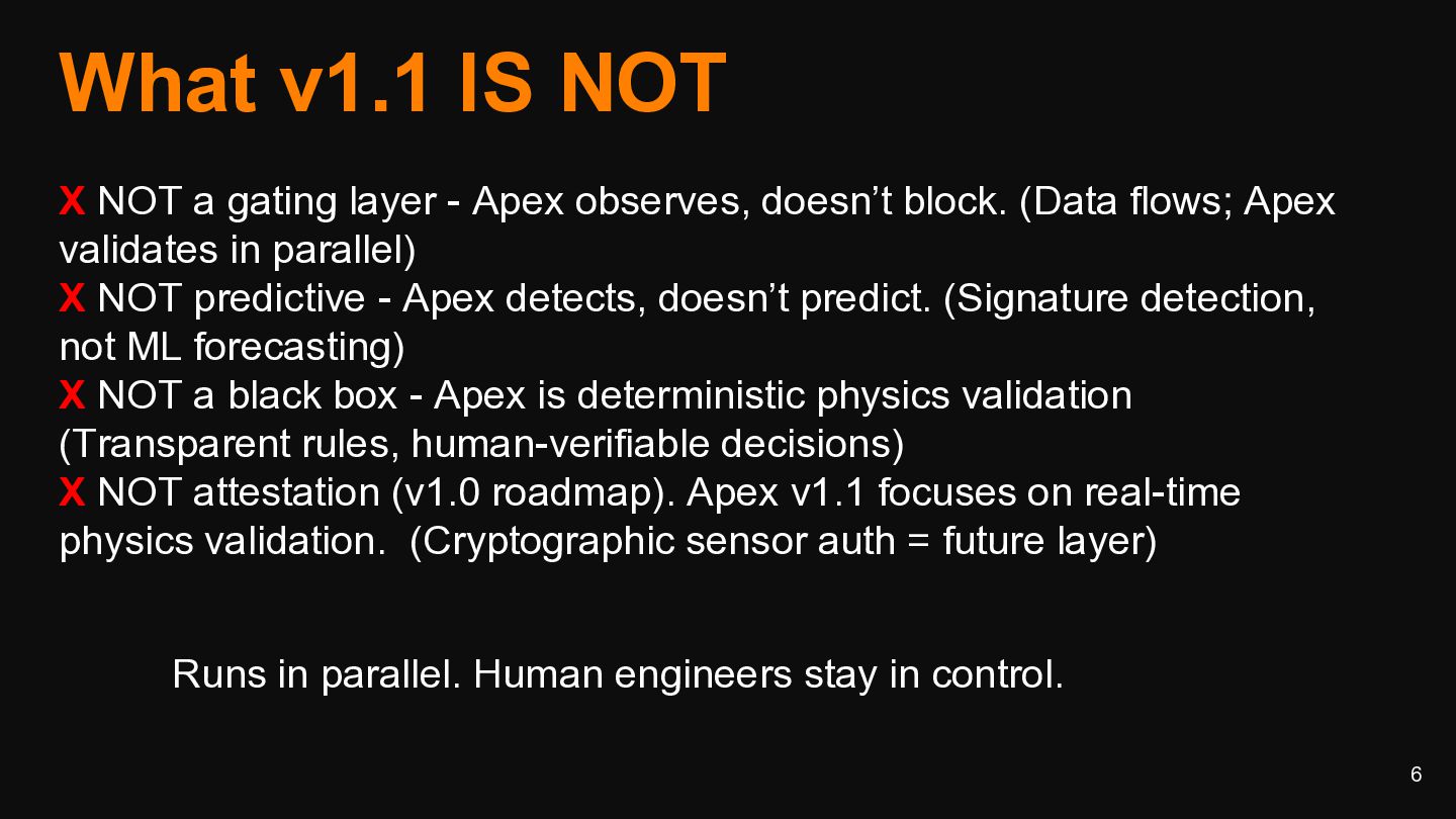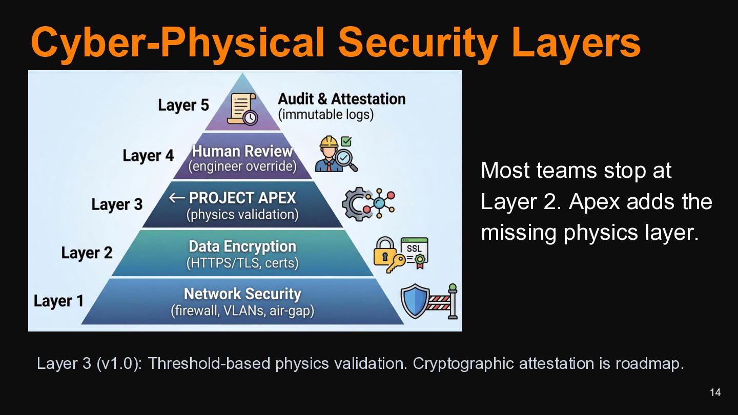 Formula 1's 2026 technical regulations introduced a 50:50 hybrid power unit architecture that created an attack surface spanning thermal, electrical, and software interdependencies simultaneously. Project Apex addresses the resulting integrity gap: a real-time, physics-aware validation layer that classifies every telemetry event against MCL40's physical envelope, assigns a deterministic severity level, and surfaces anomalies to engineers in under 10 milliseconds - before a sensor fault, software bug, or adversarial input can propagate into a safety-critical decision.