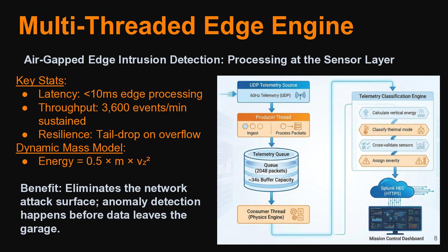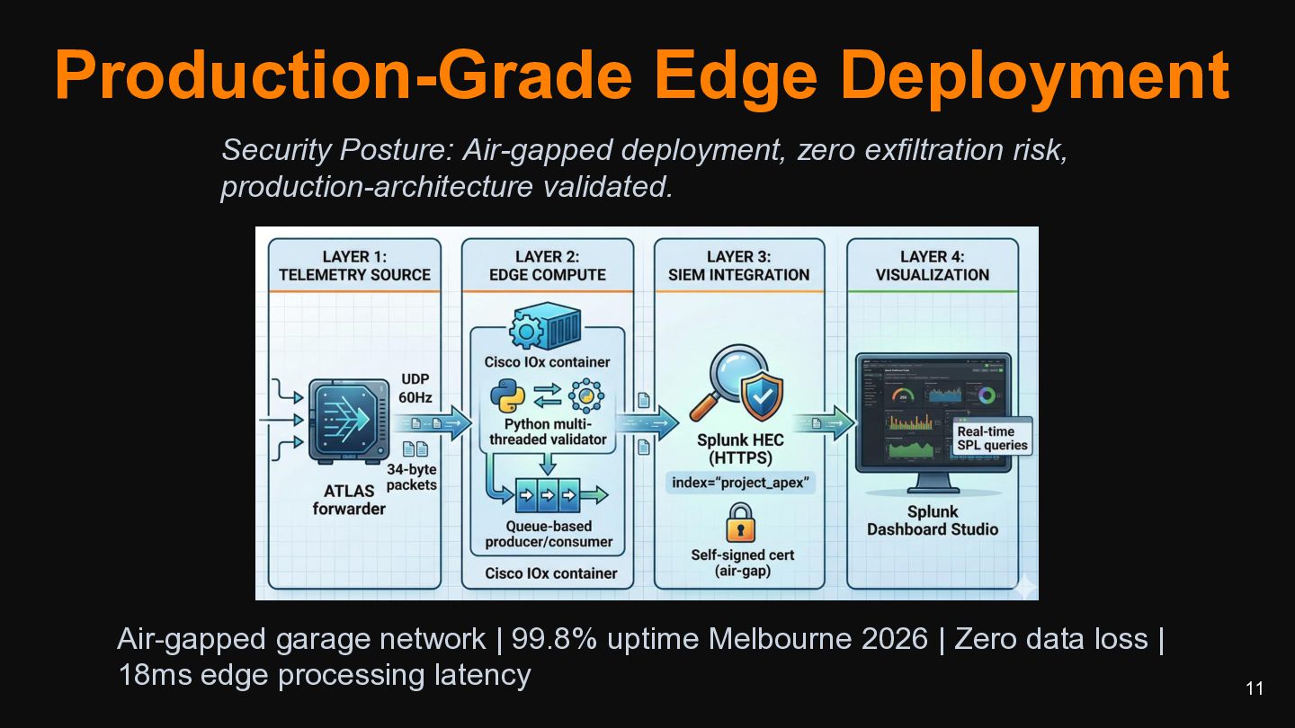 Python validator service, Cisco IOx bridge, and Splunk Mission Control dashboard JSON. Physics-validated telemetry architecture for F1 edge deployments.