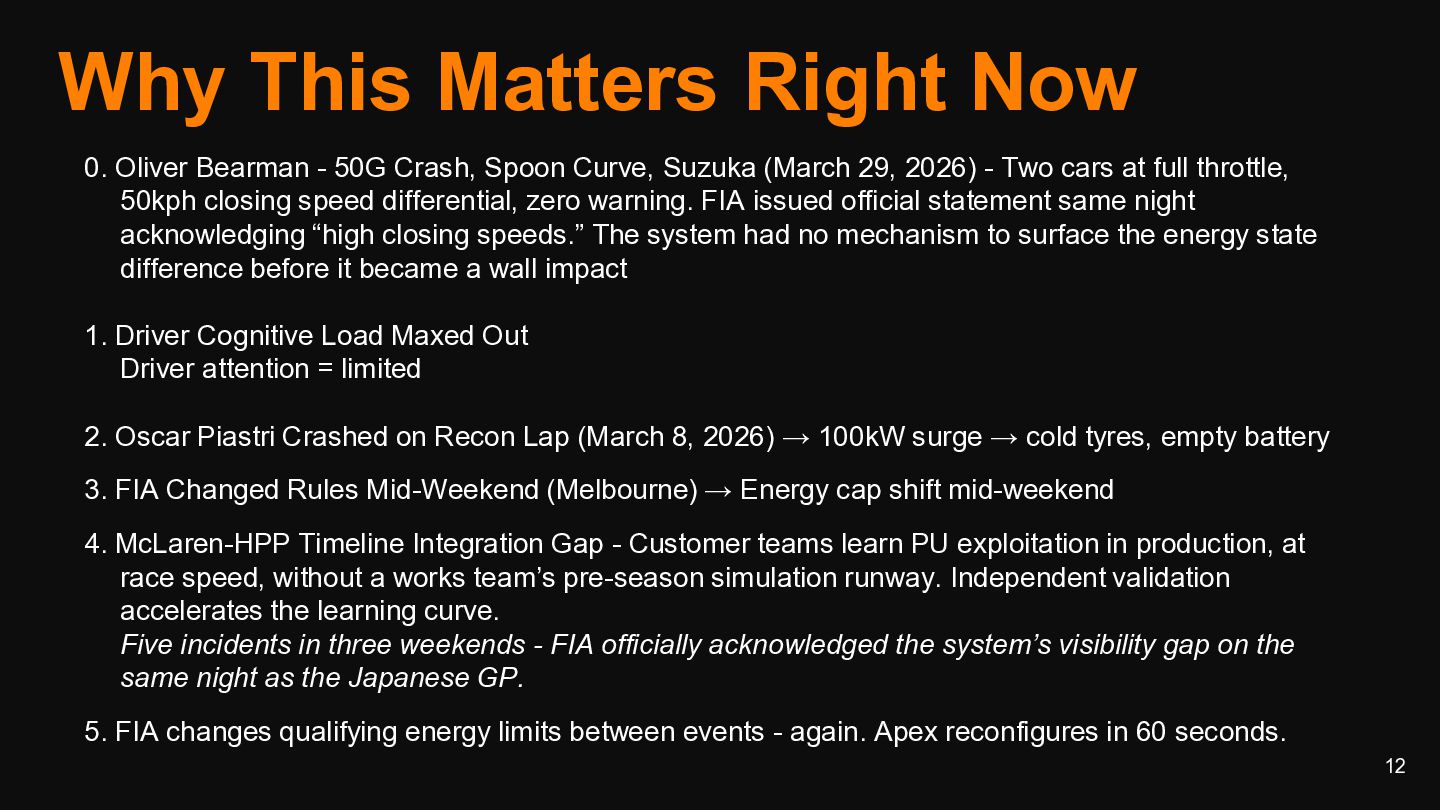 Pre-conference article connecting the Bearman crash at Suzuka to the physics-layer integrity gap Project Apex was built to address.