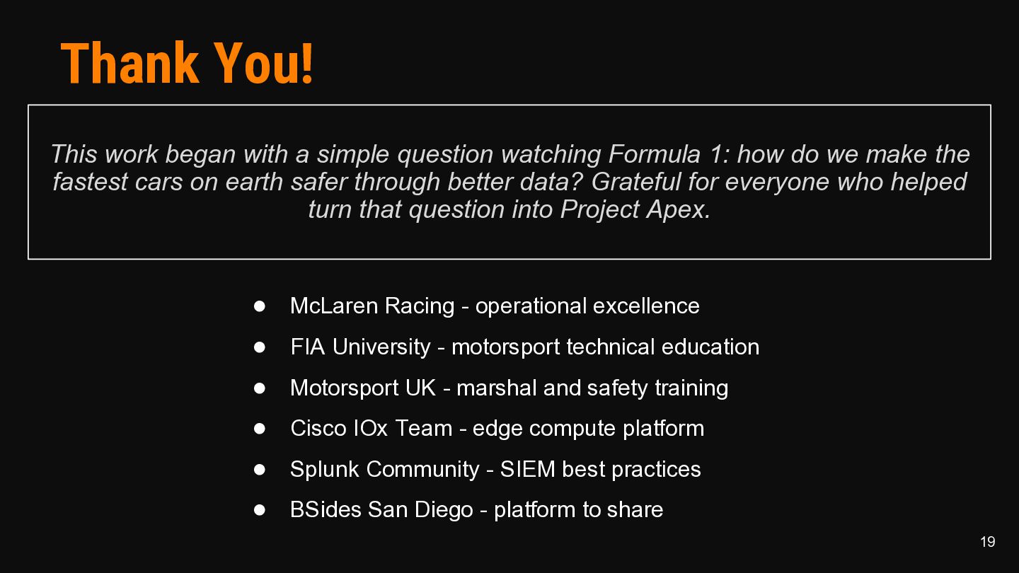 Full conference talk page including slide deck download, Project Apex GitHub repository, architecture overview, and Splunk Mission Control dashboard.