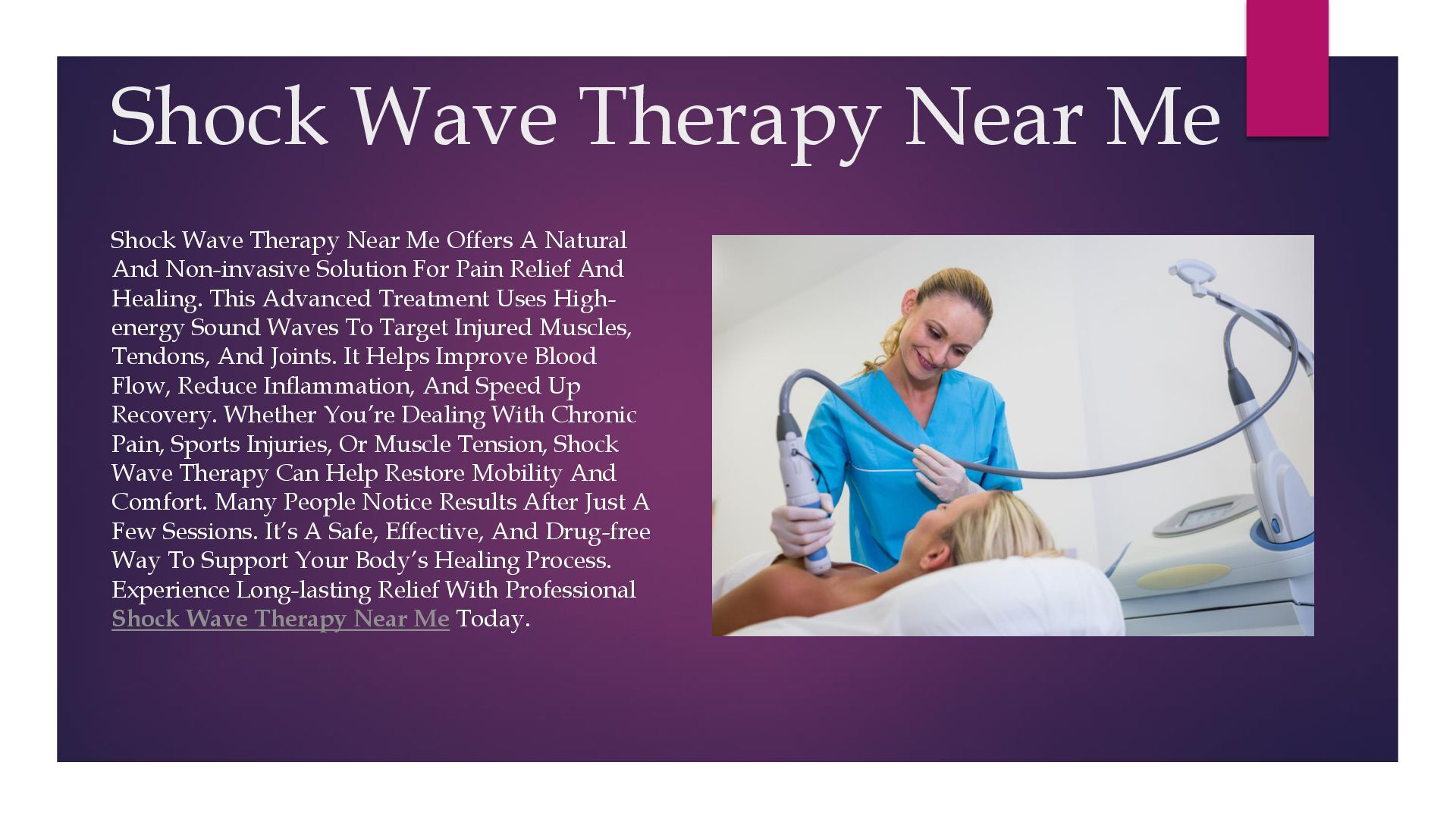 Offers A Natural And Non-invasive Solution For Pain Relief And Healing. This Advanced Treatment Uses High- energy Sound Waves To Target Injured Muscles, Tendons, And Joints. It Helps Improve Blood Flow, Reduce Inflammation, And Speed Up Recovery. Whether You’re Dealing With Chronic Pain, Sports Injuries, Or Muscle Tension, Shock Wave Therapy Can Help Restore Mobility And Comfort. Many People Notice Results After Just A Few Sessions. It’s A Safe, Effective, And Drug-free Way To Support Your Body’s Healing Process. Experience Long-lasting Relief With Professional Shock Wave Therapy Near Me Today.
