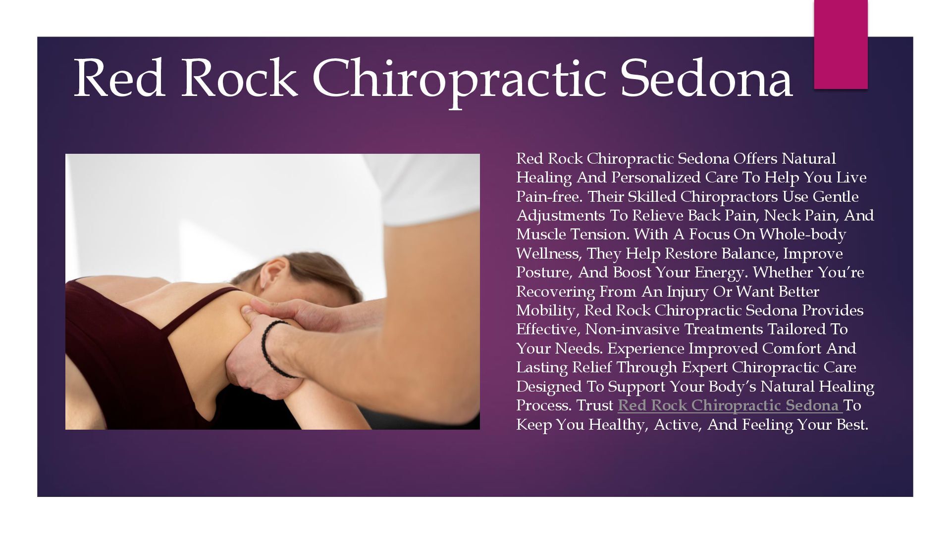 Healing And Personalized Care To Help You Live Pain-free. Their Skilled Chiropractors Use Gentle Adjustments To Relieve Back Pain, Neck Pain, And Muscle Tension. With A Focus On Whole-body Wellness, They Help Restore Balance, Improve Posture, And Boost Your Energy. Whether You’re Recovering From An Injury Or Want Better Mobility, Red Rock Chiropractic Sedona Provides Effective, Non-invasive Treatments Tailored To Your Needs. Experience Improved Comfort And Lasting Relief Through Expert Chiropractic Care Designed To Support Your Body’s Natural Healing Process. Trust Red Rock Chiropractic Sedona To Keep You Healthy, Active, And Feeling Your Best.