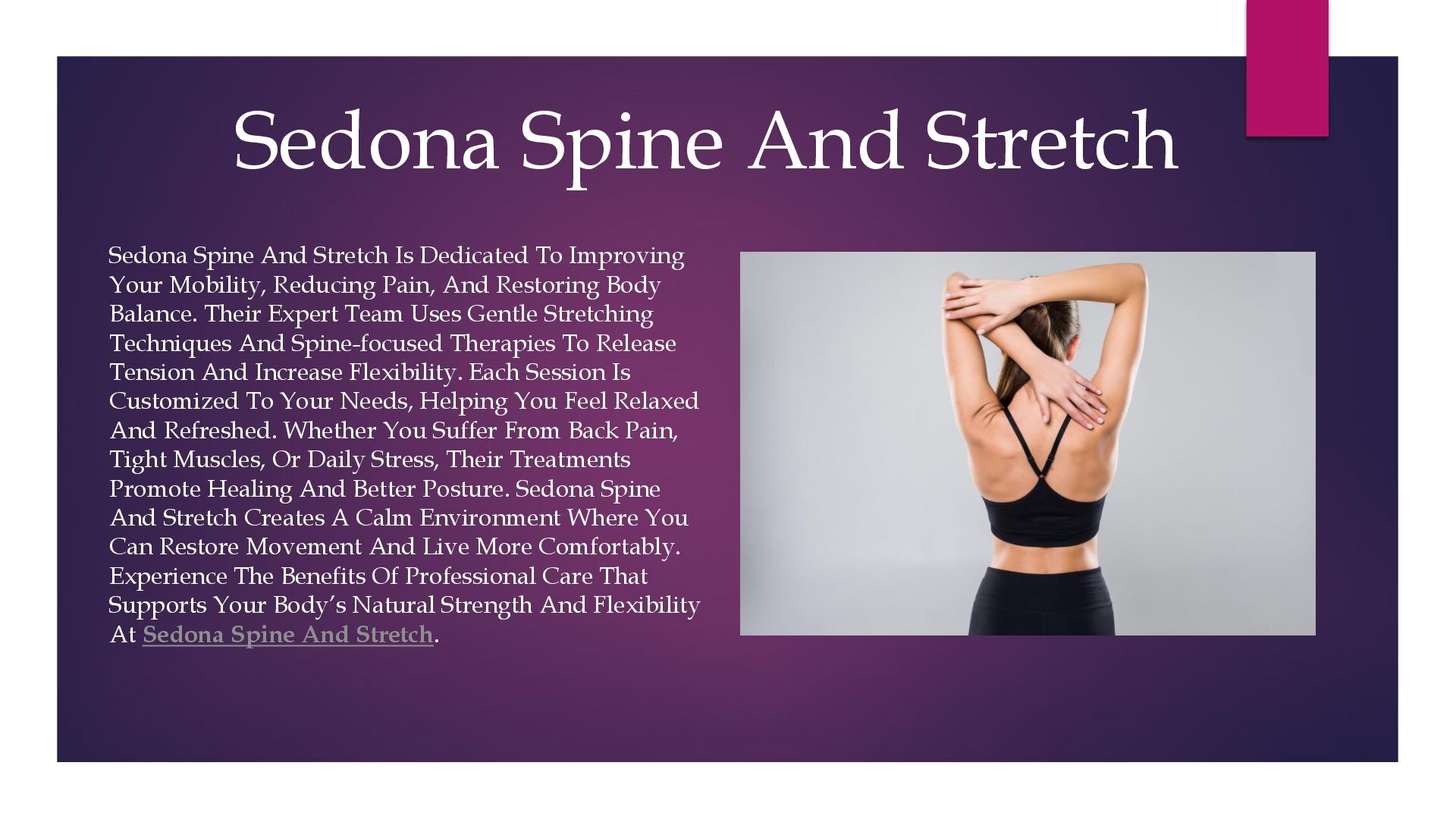 To Improving Your Mobility, Reducing Pain, And Restoring Body Balance. Their Expert Team Uses Gentle Stretching Techniques And Spine-focused Therapies To Release Tension And Increase Flexibility. Each Session Is Customized To Your Needs, Helping You Feel Relaxed And Refreshed. Whether You Suffer From Back Pain, Tight Muscles, Or Daily Stress, Their Treatments Promote Healing And Better Posture. Sedona Spine And Stretch Creates A Calm Environment Where You Can Restore Movement And Live More Comfortably. Experience The Benefits Of Professional Care That Supports Your Body’s Natural Strength And Flexibility At Sedona Spine And Stretch.